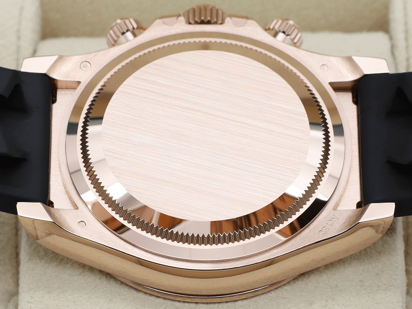 The Rolex Factory Black Rubber Oysterflex Strap is Fitted with the 18ct Rose Gold Double Folding Safety Clasp and Glidelock.