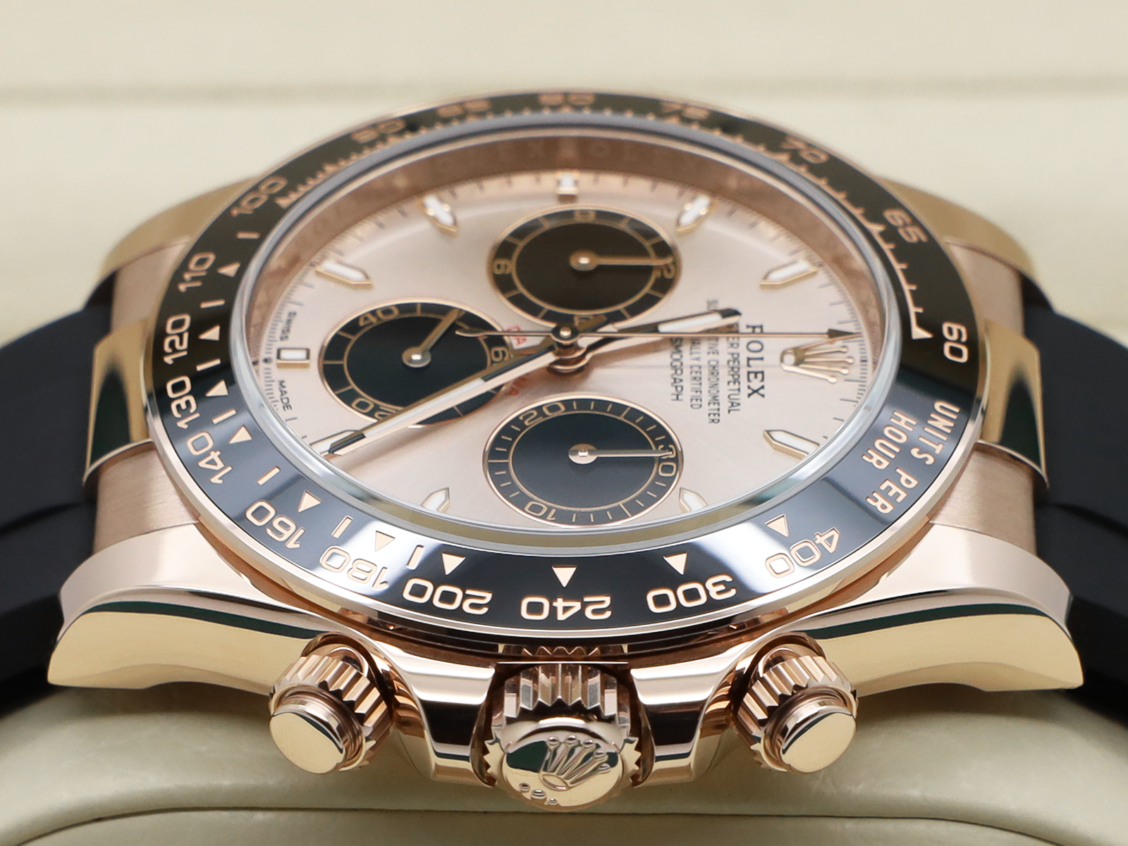 Stunning Gents Rolex Daytona “New Model” Watch in 18ct Rose Gold with a Sundust Dial and 18ct Rose Gold Bezel with a Black Ceramic Insert Set with Numerals on The Black Rubber Oysterflex Strap.