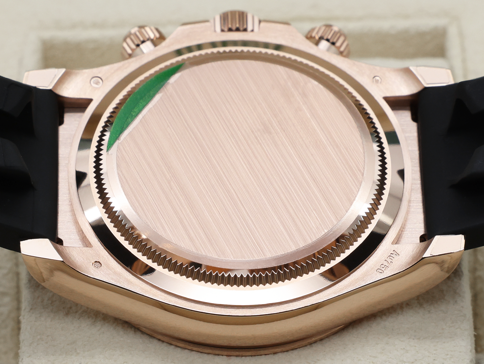 The Rolex Factory Black Rubber Oysterflex Strap is Fitted with the 18ct Rose Gold Double Folding Safety Clasp and Glidelock.