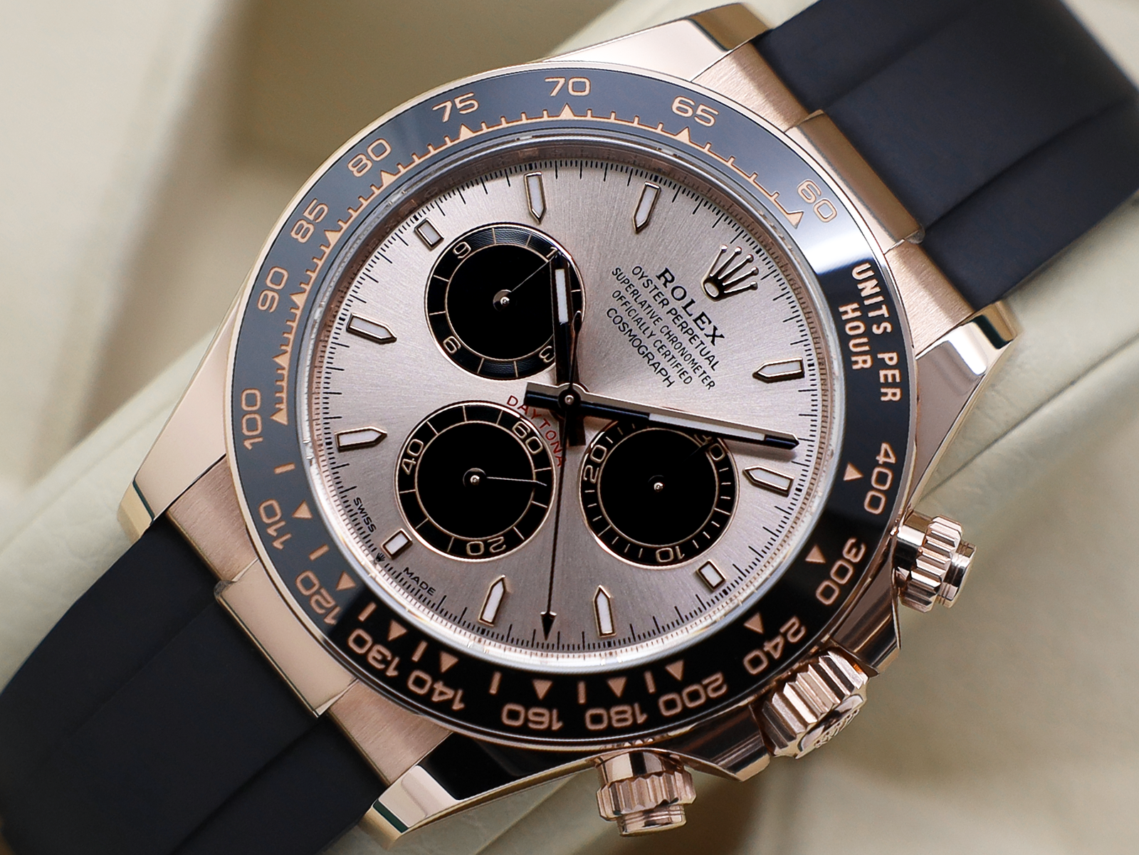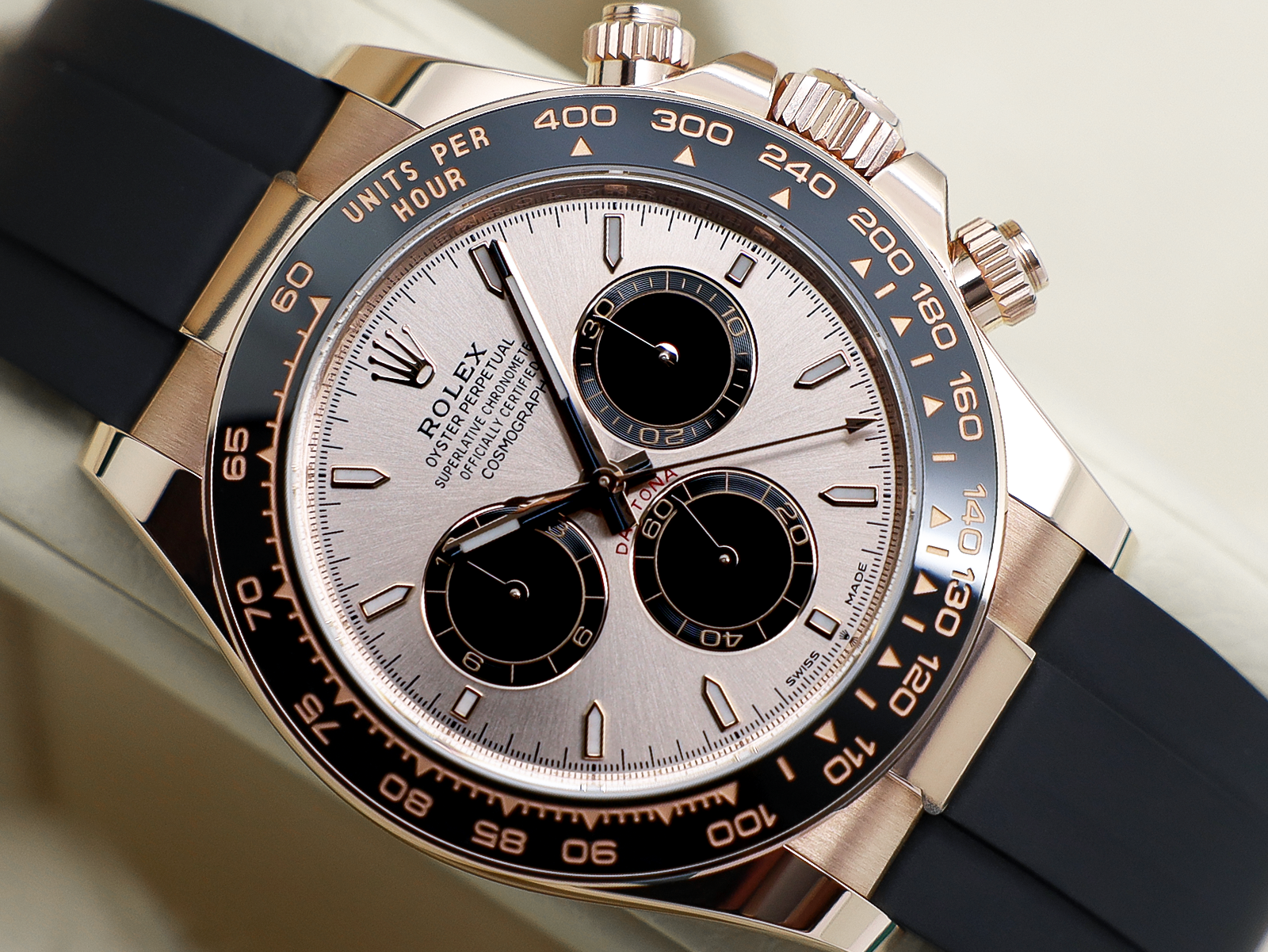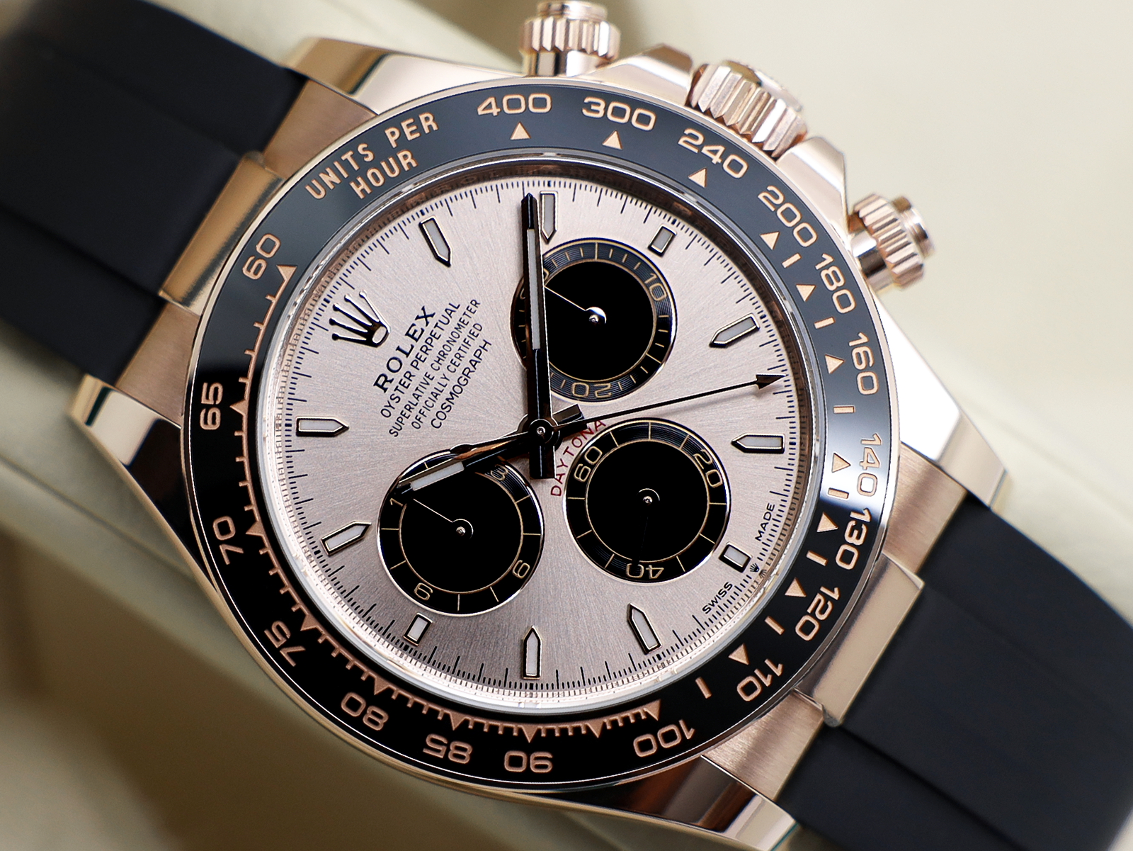Stunning Gents Rolex Daytona “New Model” Watch in 18ct Rose Gold with a Sundust Dial and 18ct Rose Gold Bezel with a Black Ceramic Insert Set with Numerals on The Black Rubber Oysterflex Strap.
