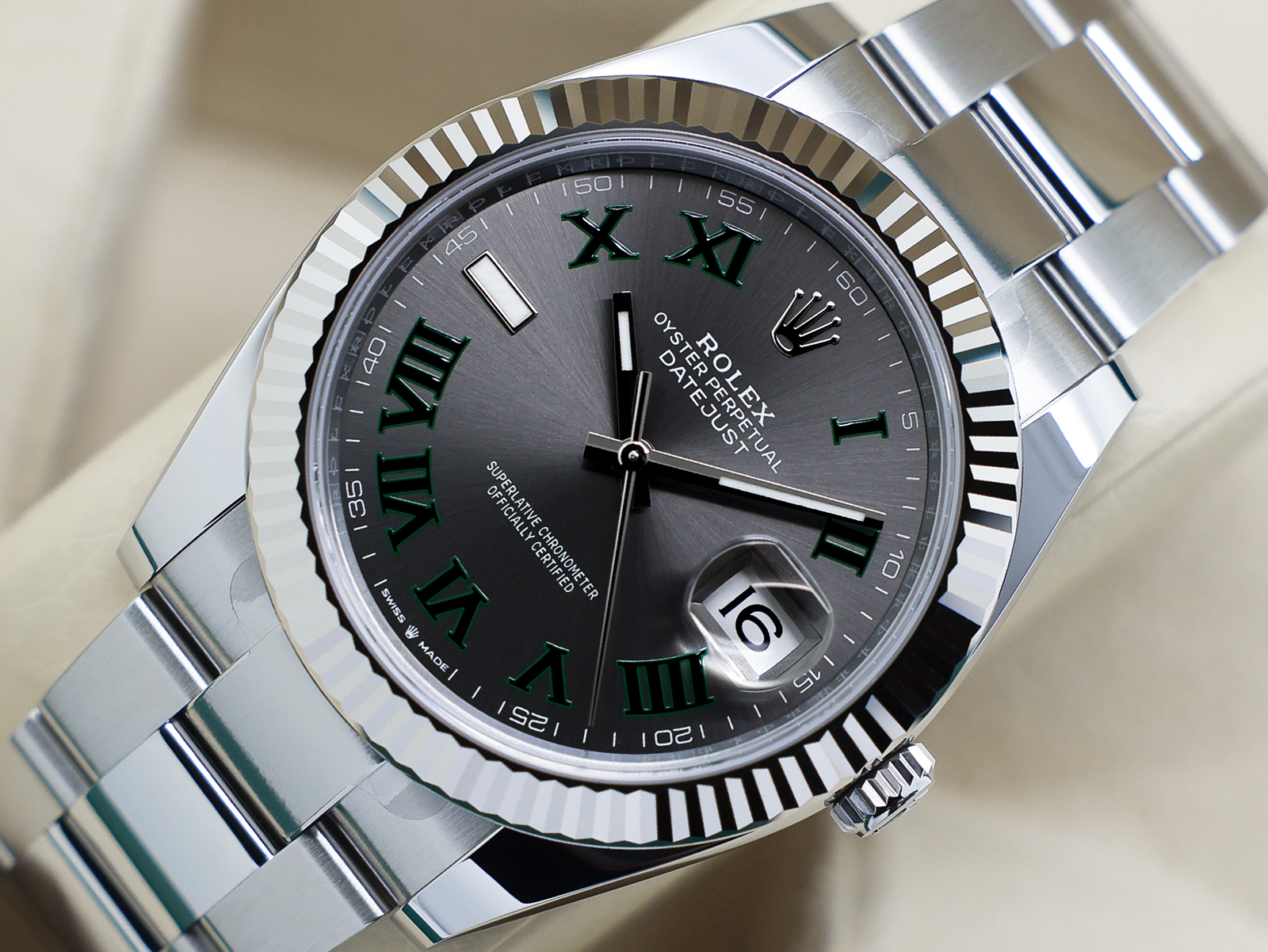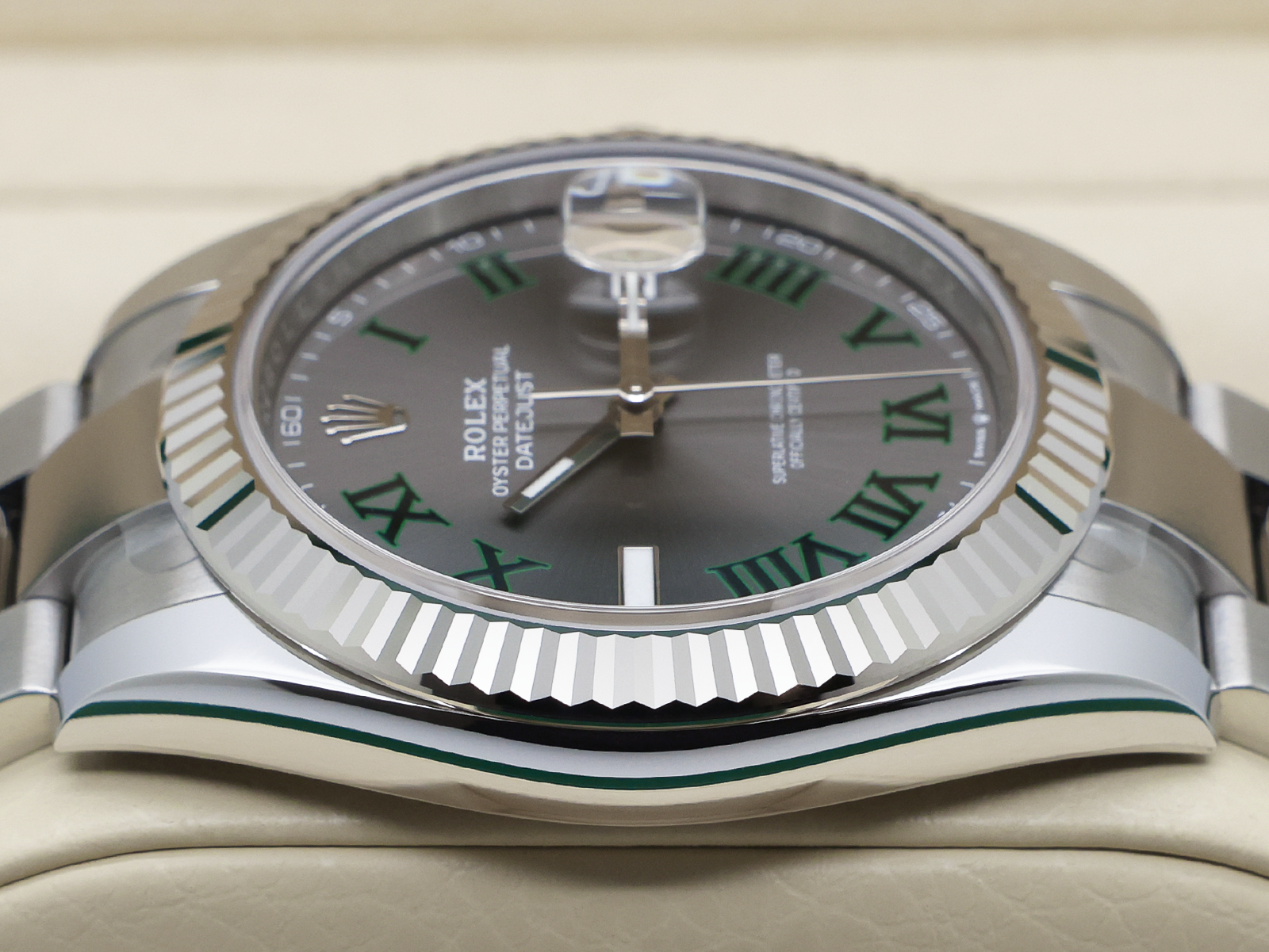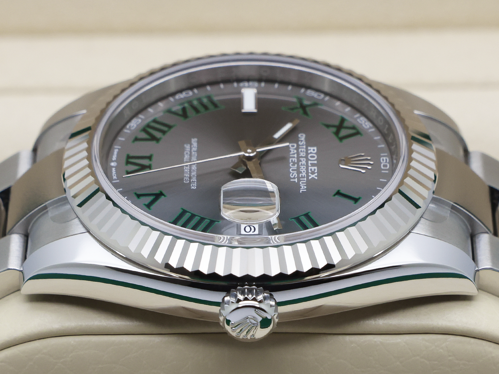It has The Stunning Highly Sought After Factory Slate Grey ‘Wimbledon’ Dial Set with Green Outlined Black Roman Numeral Markers, 18ct White Gold Rolex Crown and 18ct White Gold Luminous Hands. This is a Very Rich looking and Easy to Read Factory Dial.