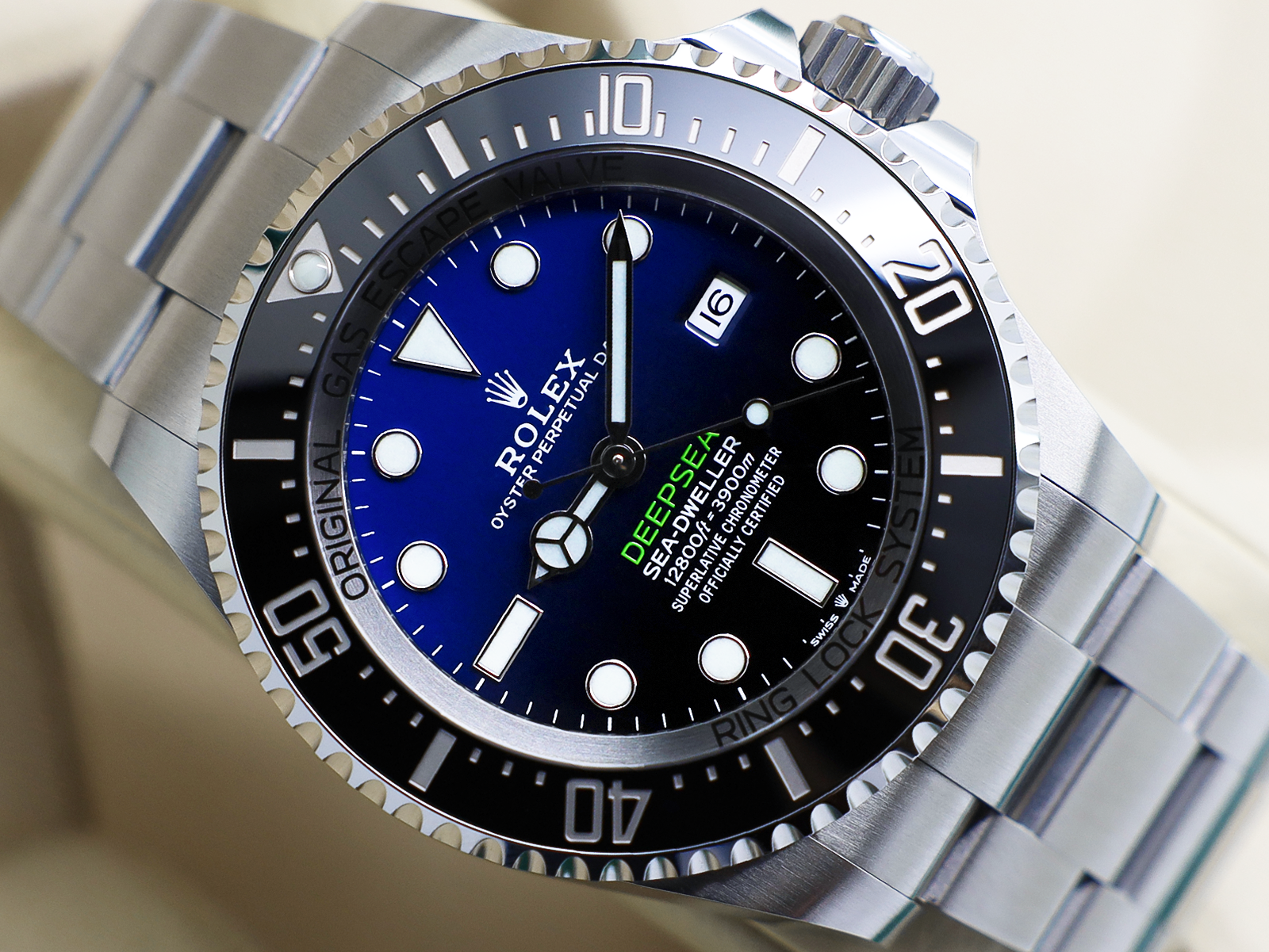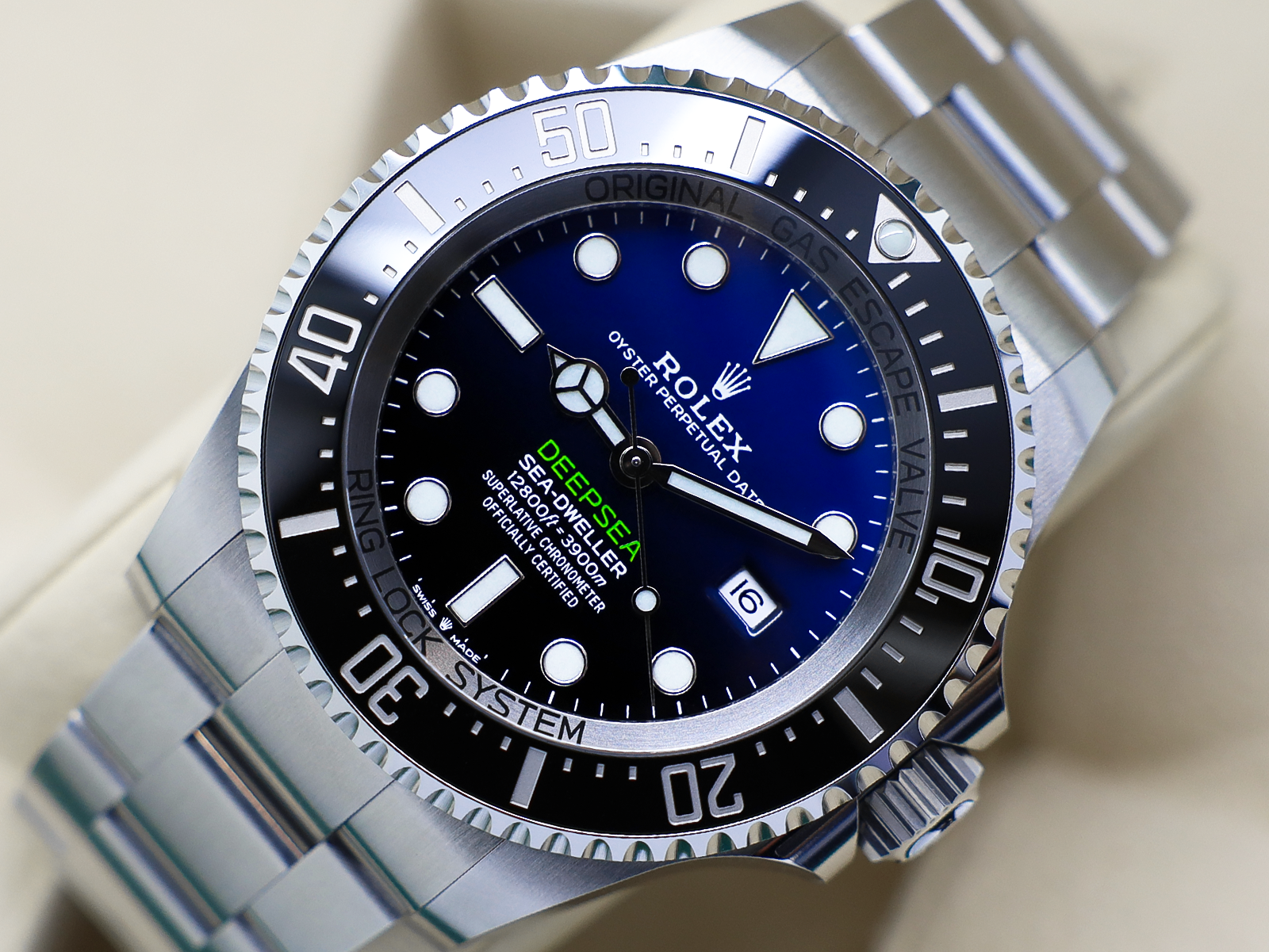 Stunning Gents Rolex Deepsea Sea-Dweller 44mm D-Blue James Cameron Watch in Stainless Steel with a Blue and Black Dial and Stainless Steel Rotating Bezel with a Black Ceramic Insert.