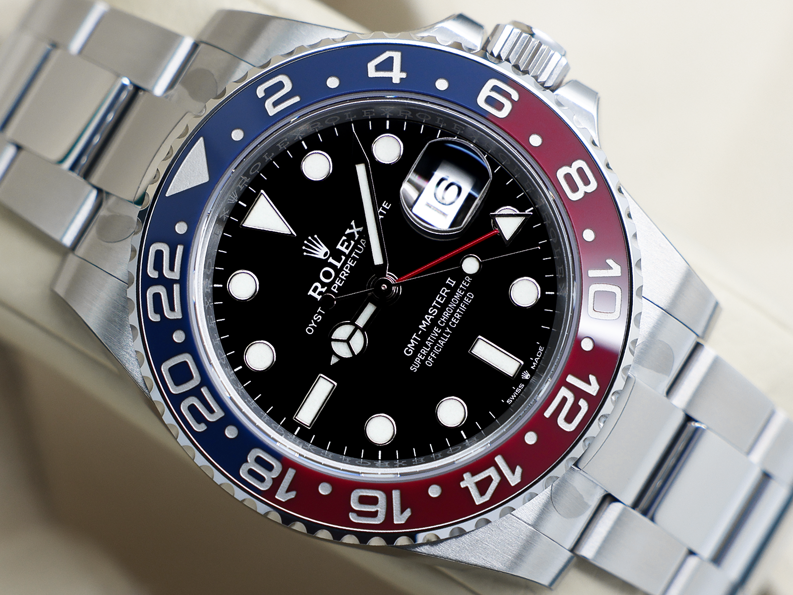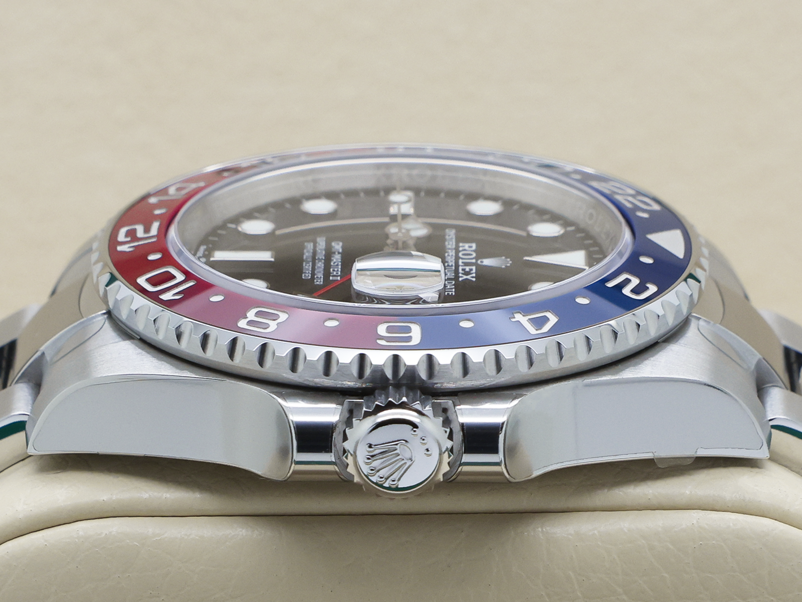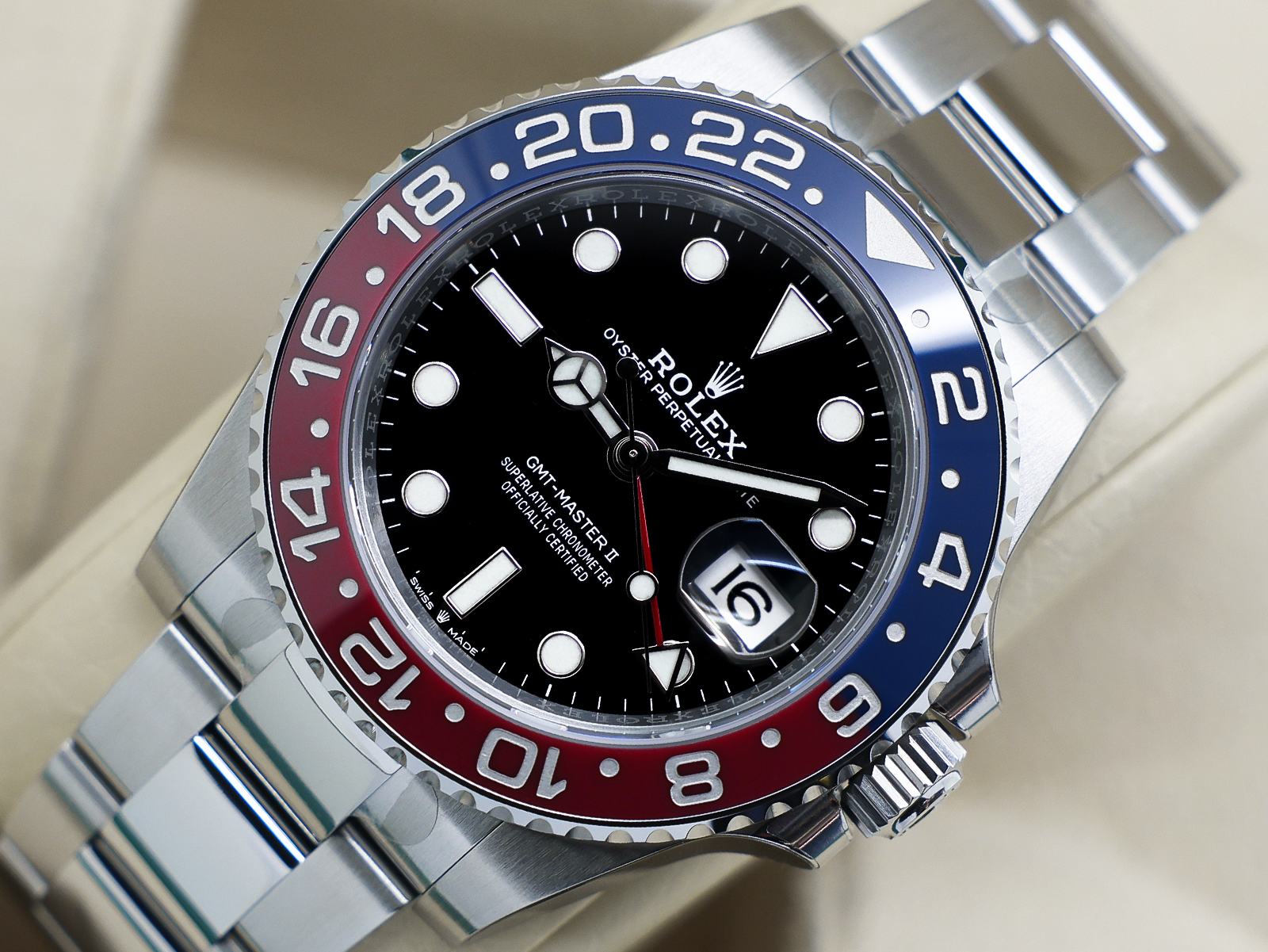Stunning Gents Rolex GMT-Master II “Pepsi” Watch in Stainless Steel with a Black Dial and Stainless Steel Rotating Bezel with a Blue and Red Ceramic Insert.