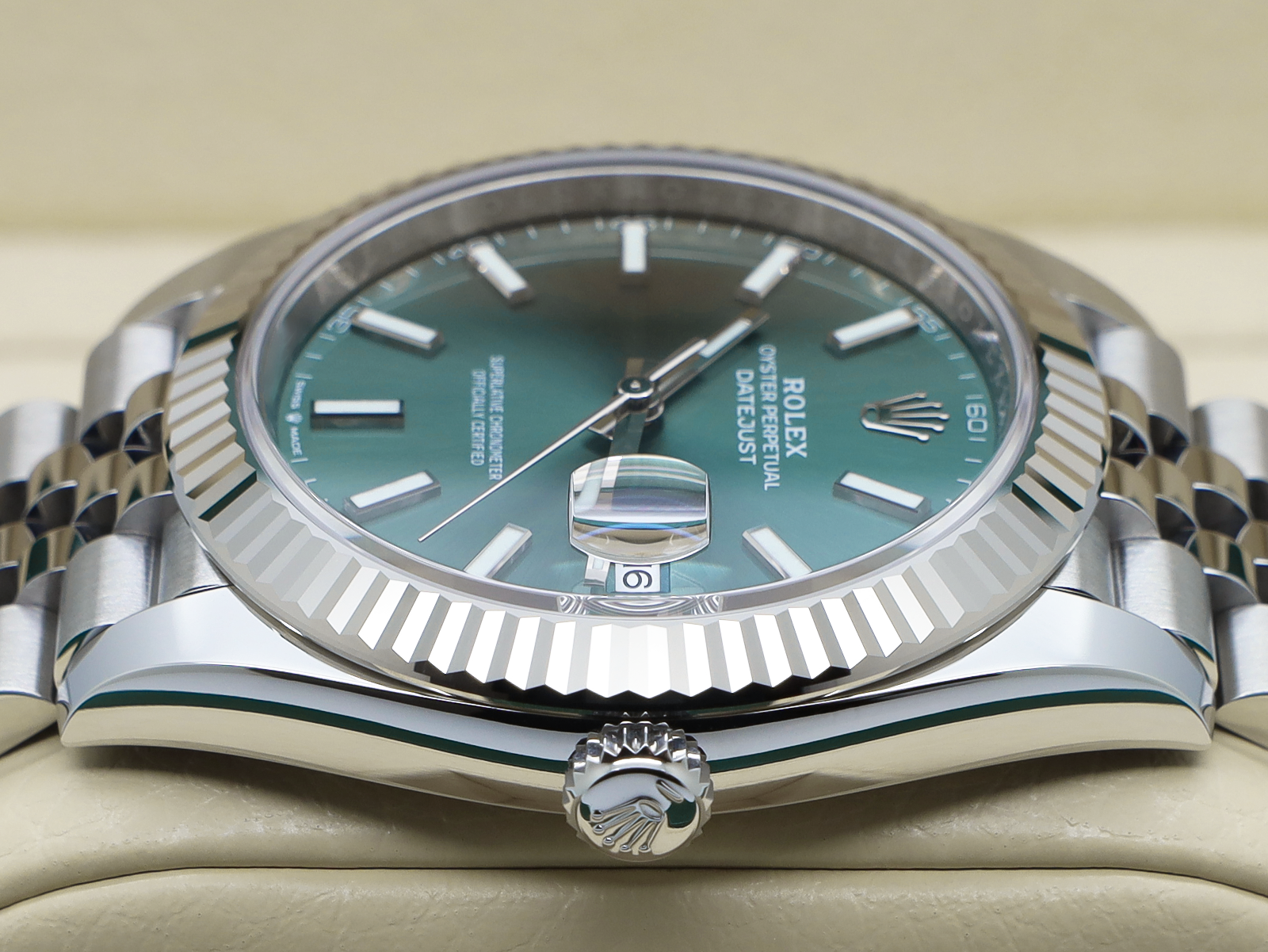 Stunning Gents Rolex Datejust 41mm Watch in Stainless Steel with a Mint Green Dial and Solid 18ct White Gold Fluted Bezel.