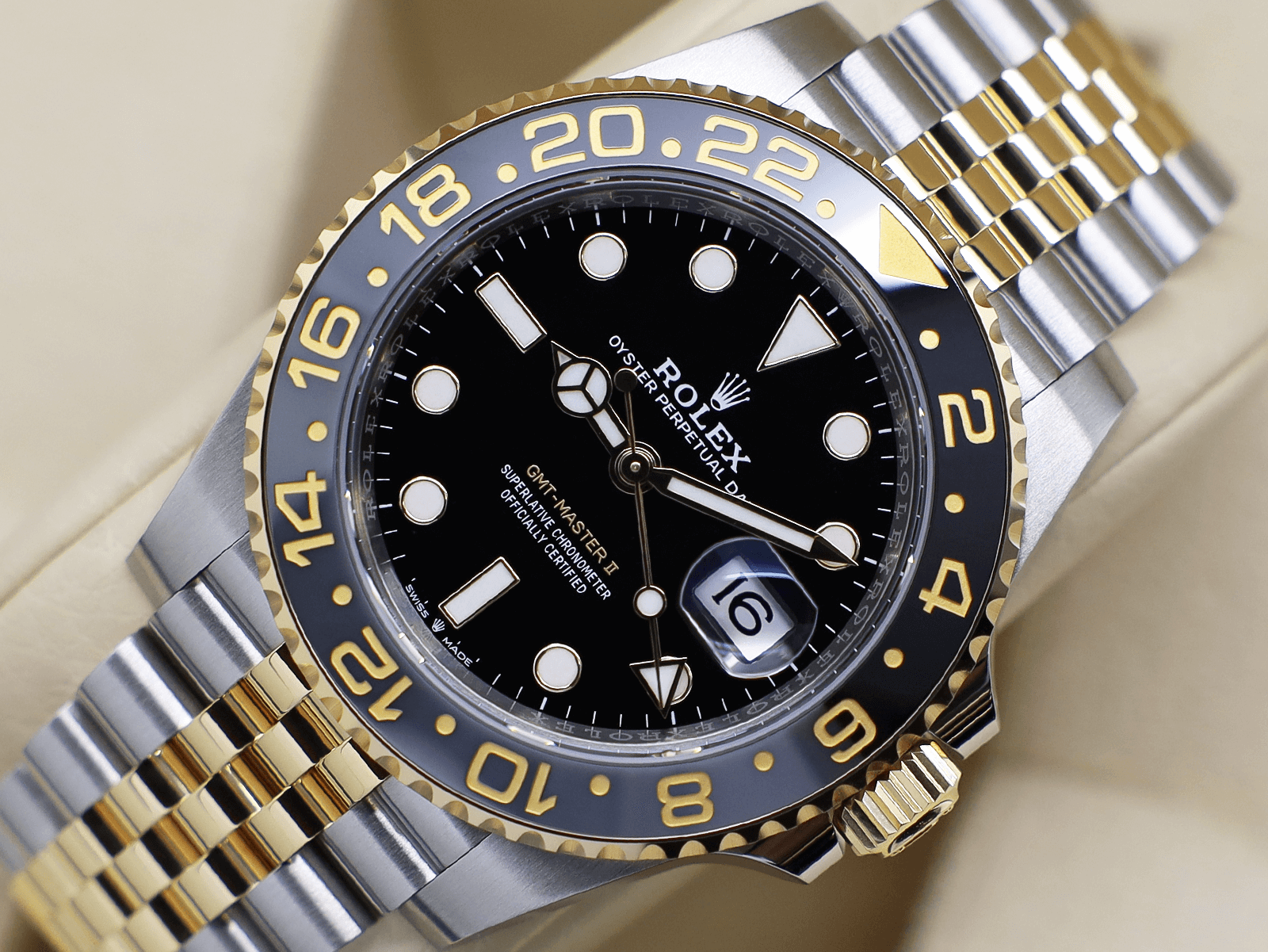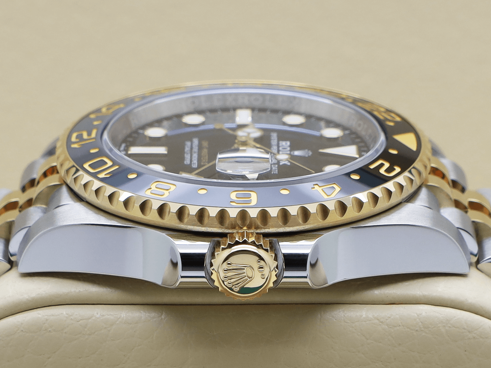 Stunning Gents Rolex GMT-Master II Watch in 18ct Yellow Gold and Stainless Steel with a Black Dial and 18ct Yellow Gold Rotating Bezel with a Grey and Black Ceramic Insert.