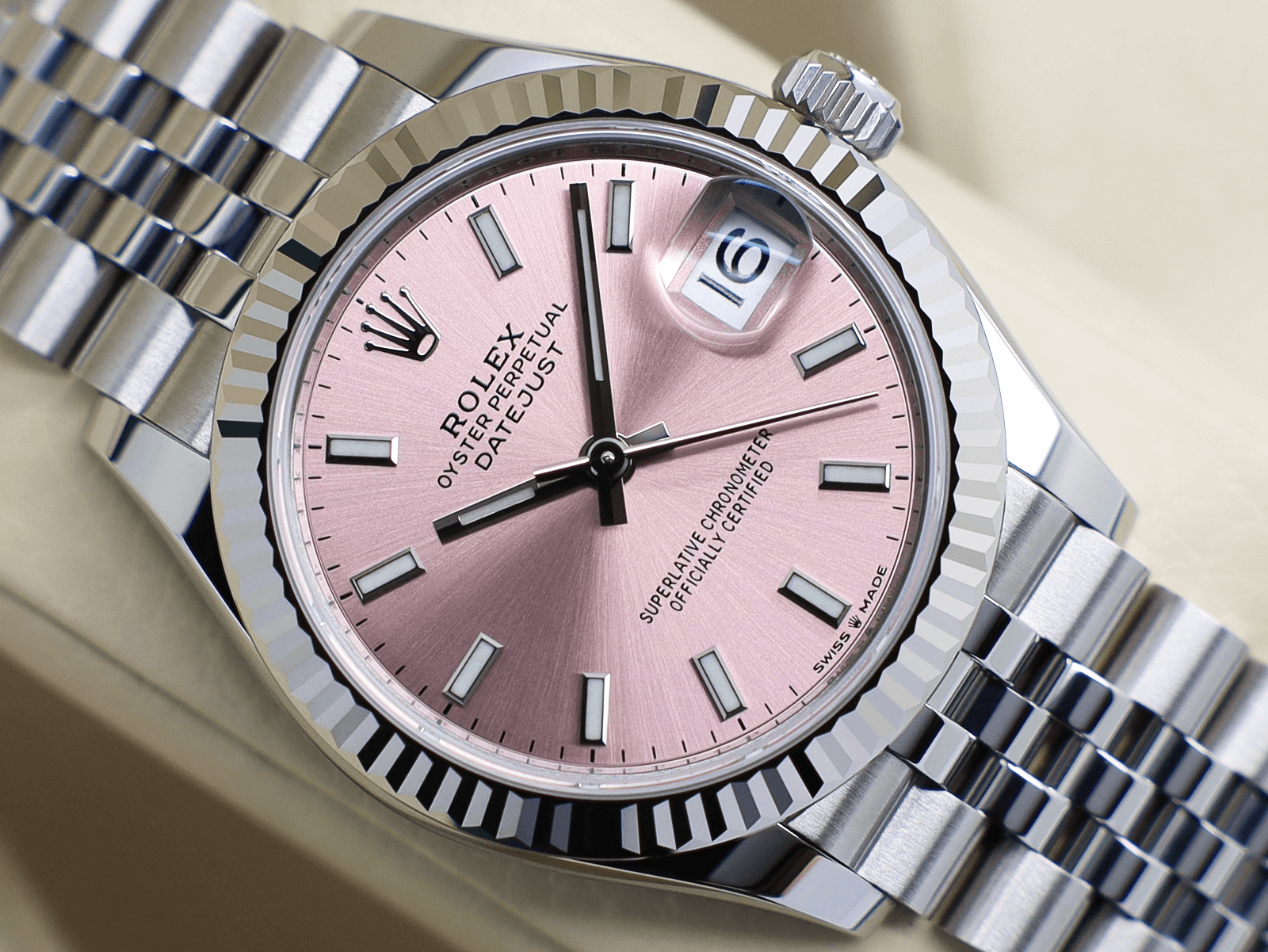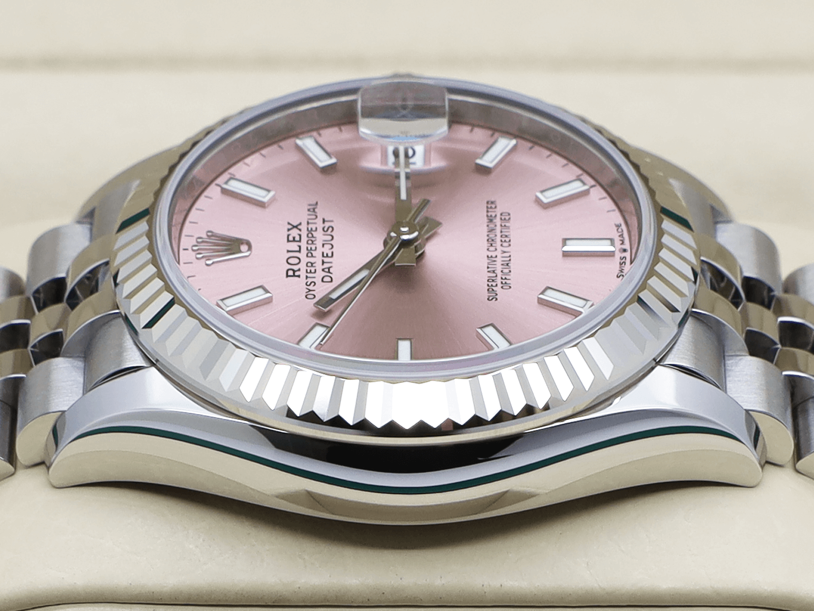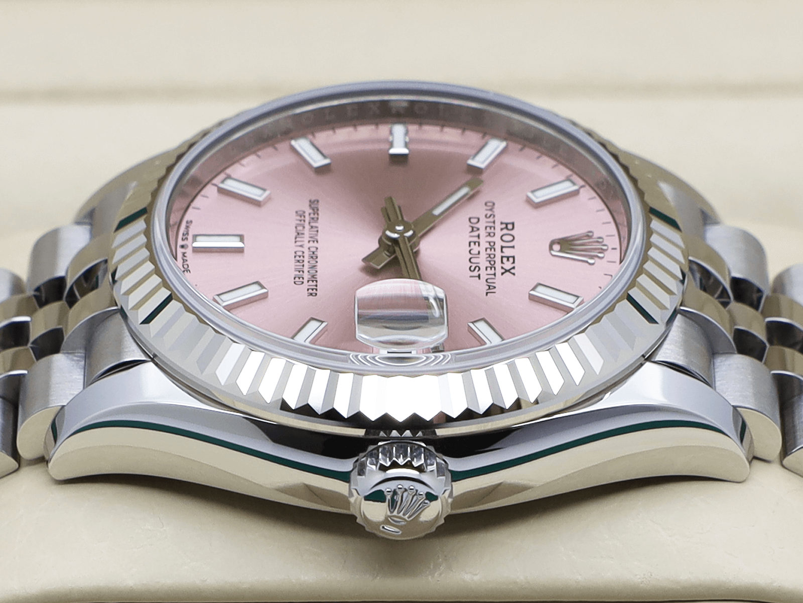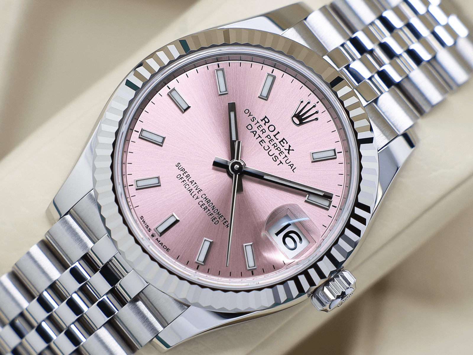 Stunning Ladies Rolex Datejust Midsize 31mm Watch in Stainless Steel with a Pink Dial and Solid 18ct White Gold Fluted Bezel.