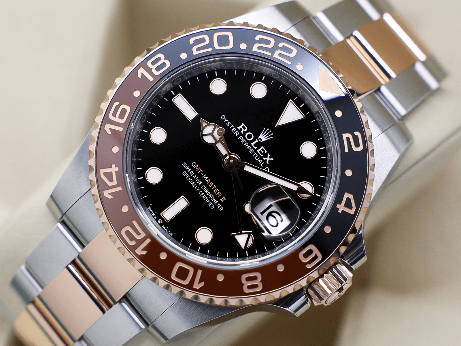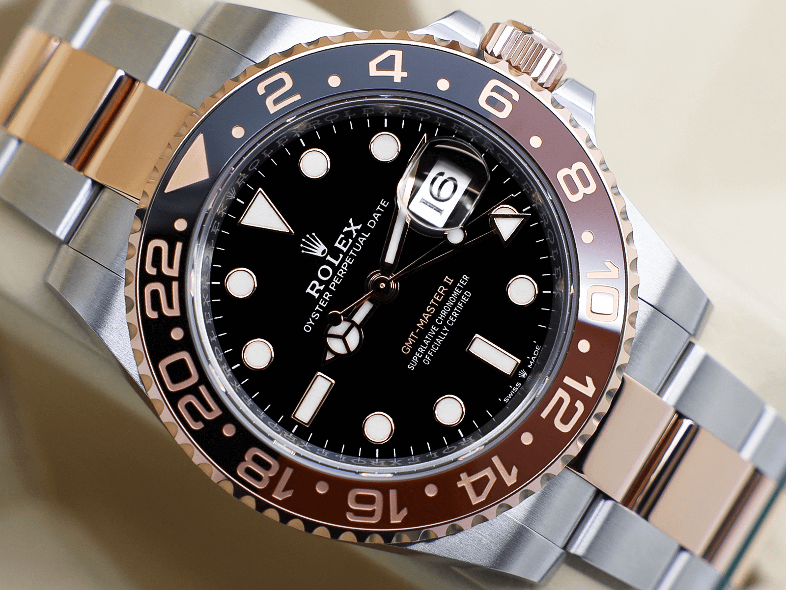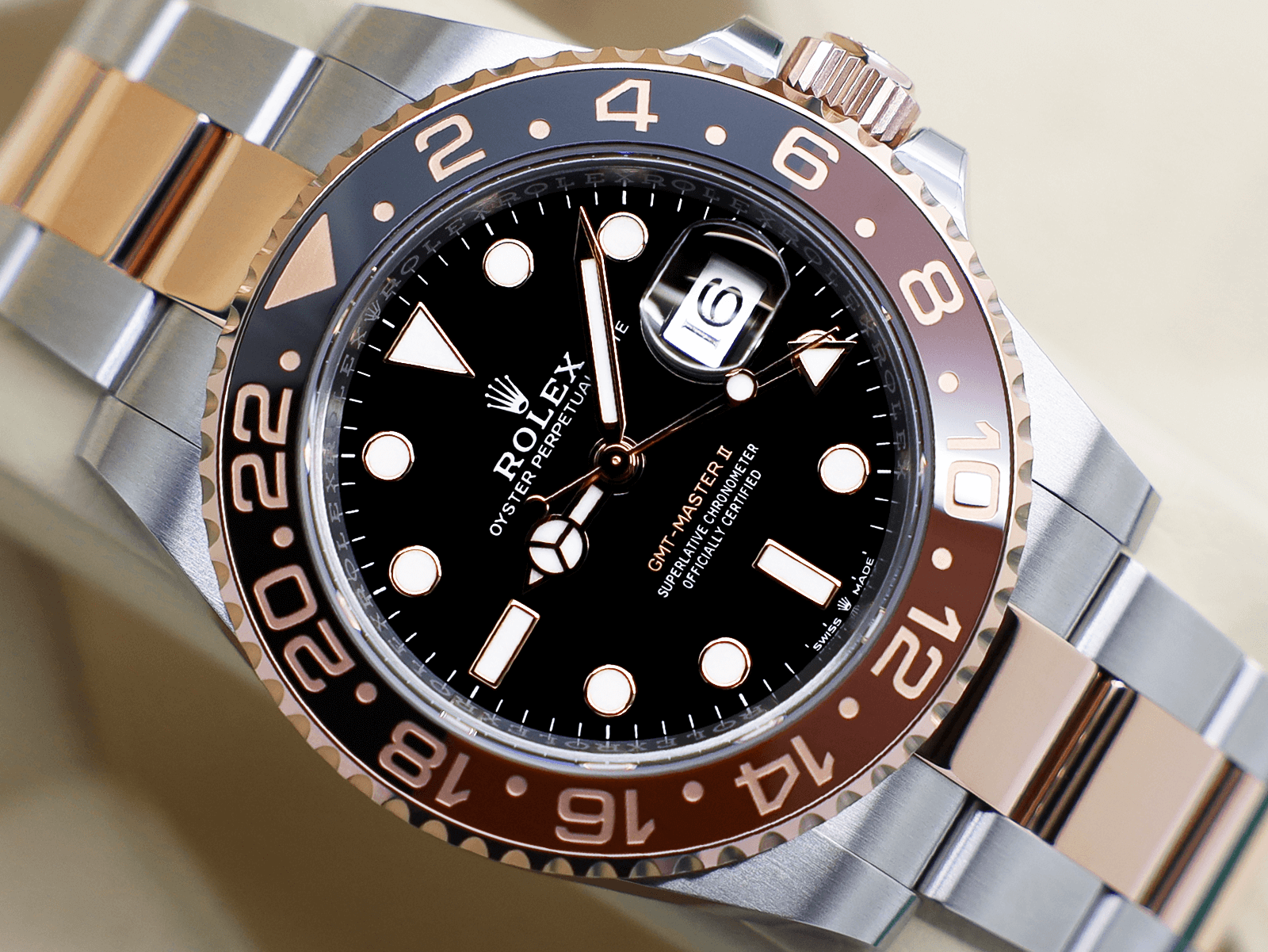 Stunning Gents Rolex GMT-Master II “Root Beer” Watch in 18ct Rose Gold and Stainless Steel with an 18ct Rose Gold Rotating Bezel with a Brown and Black Ceramic Insert.