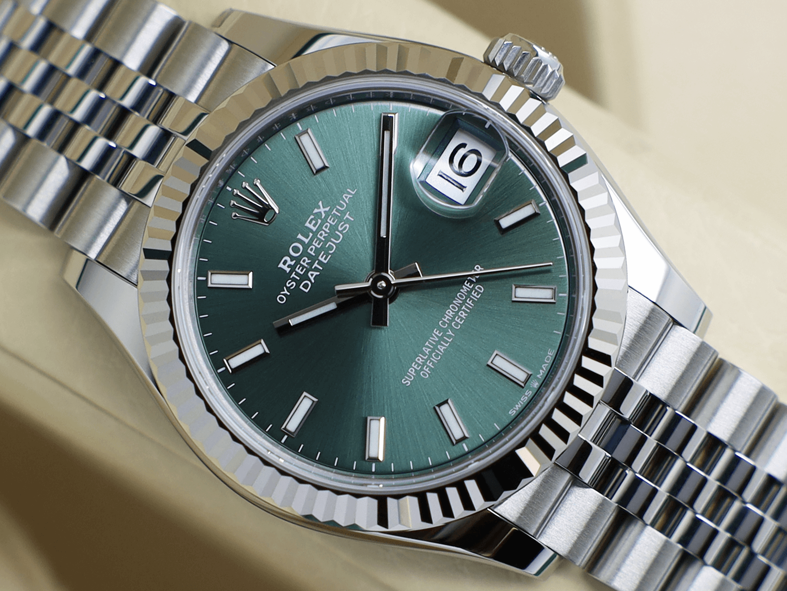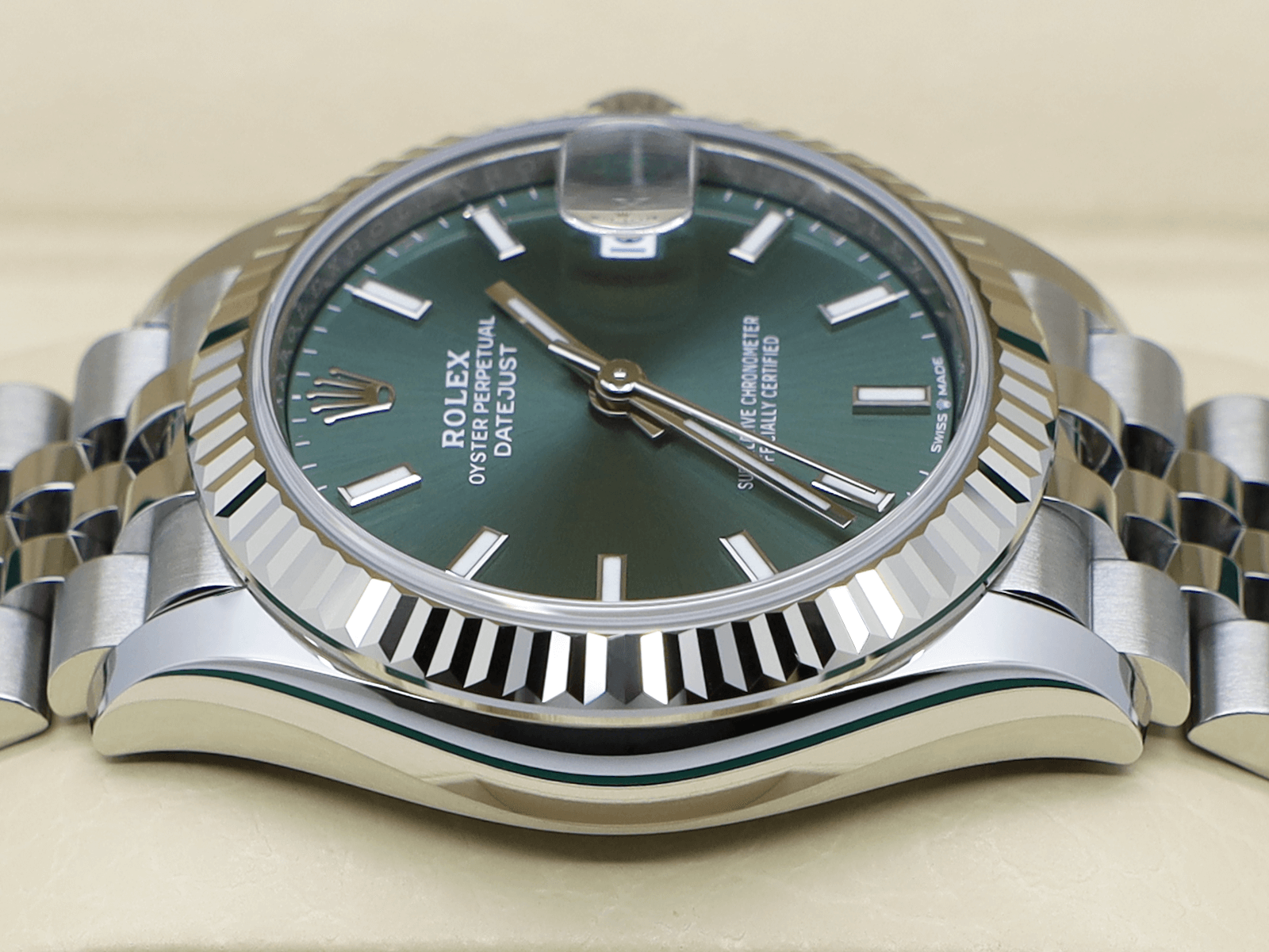 Stunning Ladies Rolex Datejust Midsize 31mm Watch in Stainless Steel with a Mint Green Dial and Solid 18ct White Gold Fluted Bezel.
