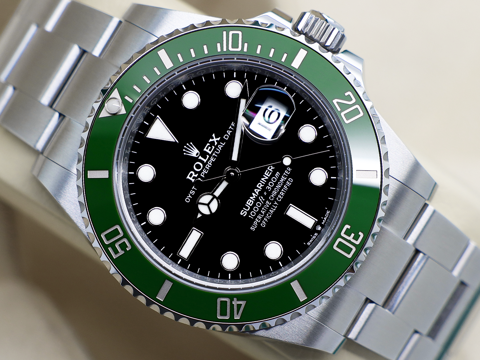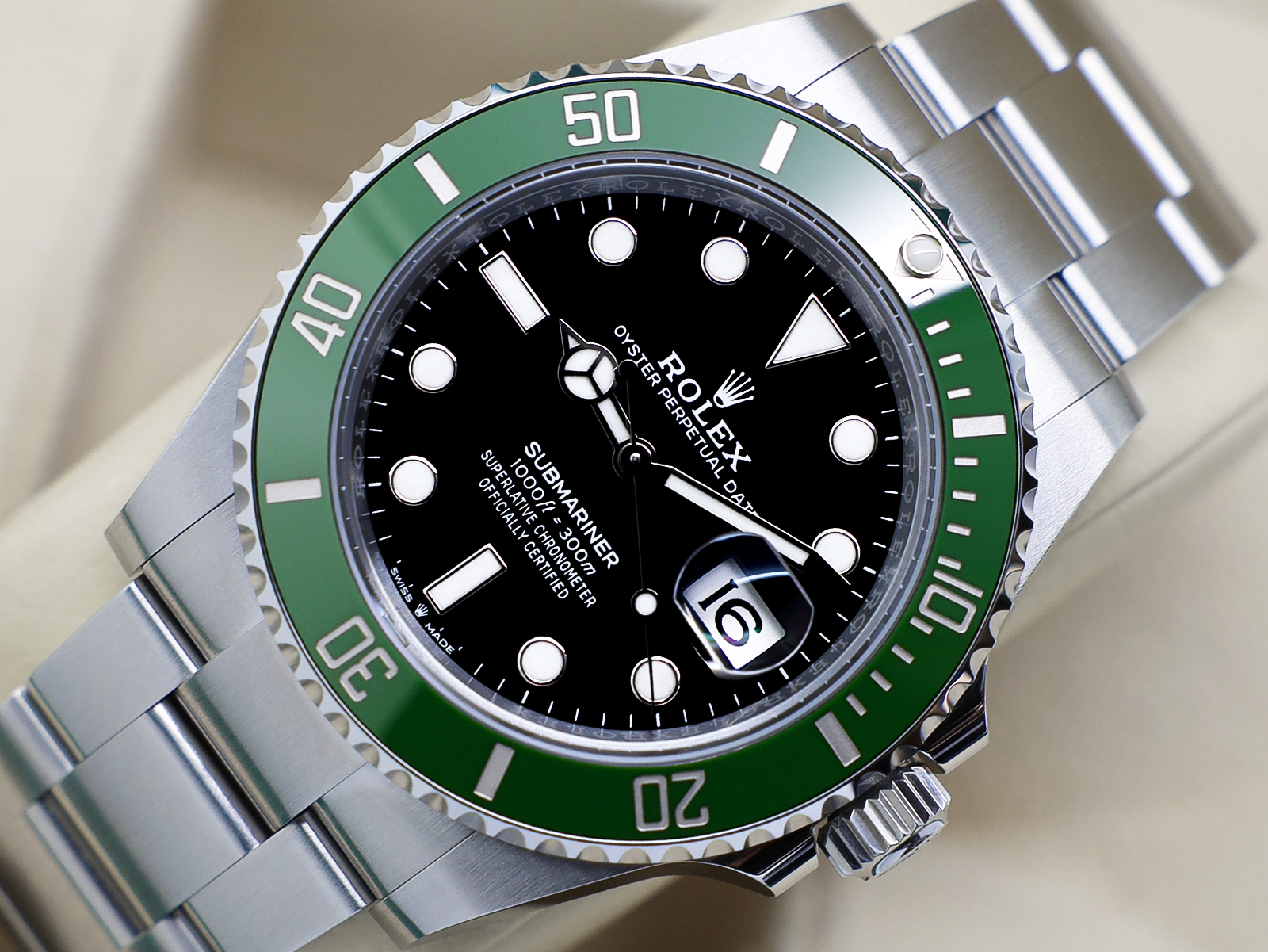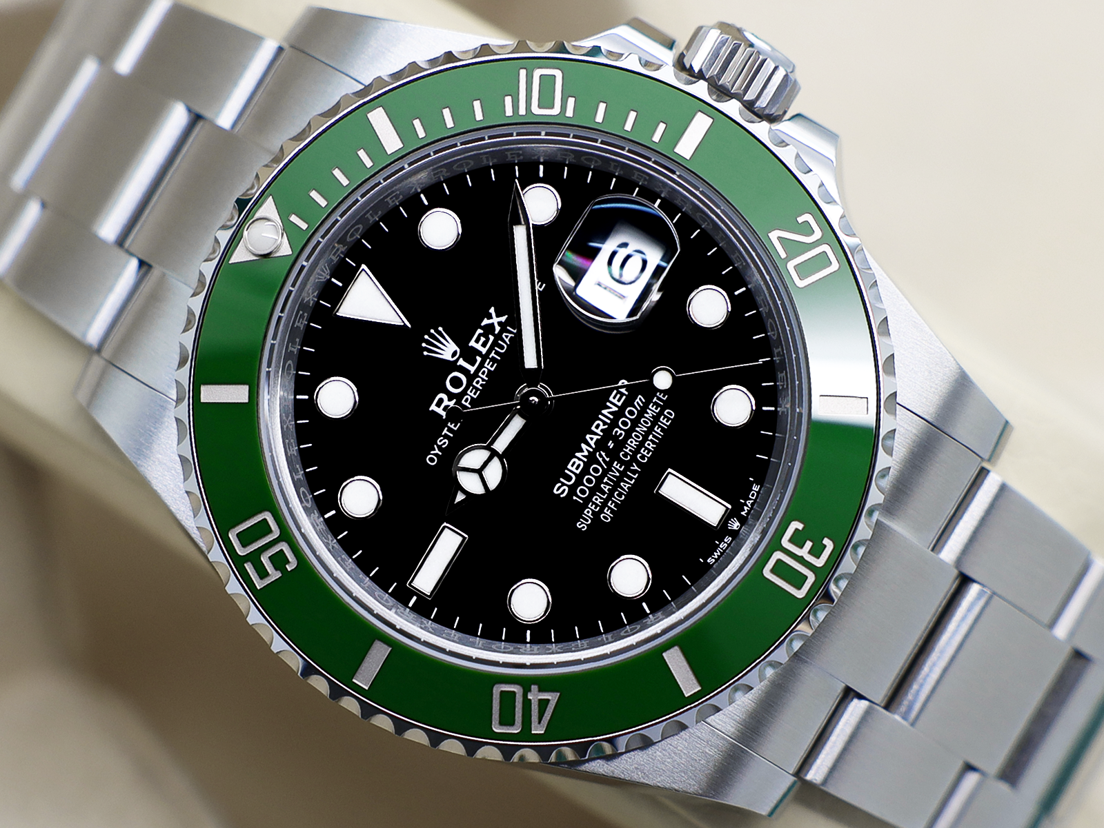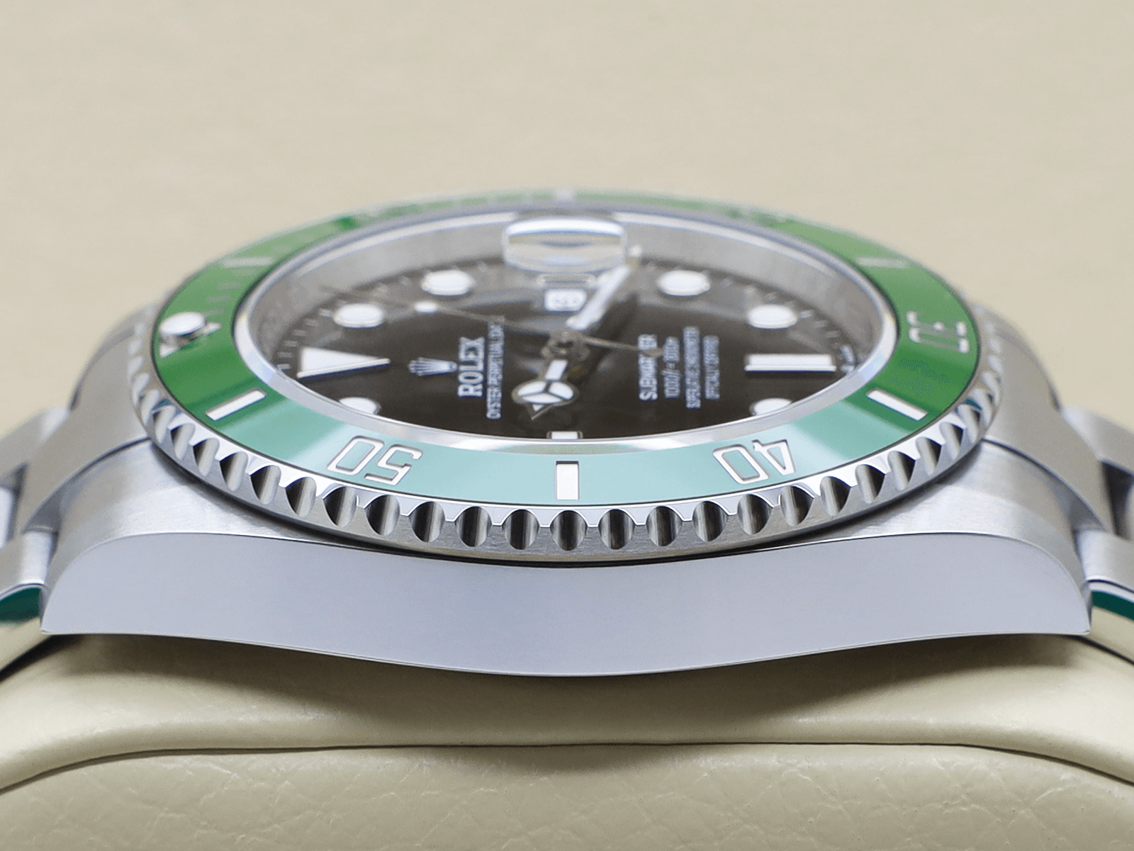 It has a Beautiful Rolex Stainless Steel Rotating Bezel Set with a Green Ceramic Insert with Numerals.