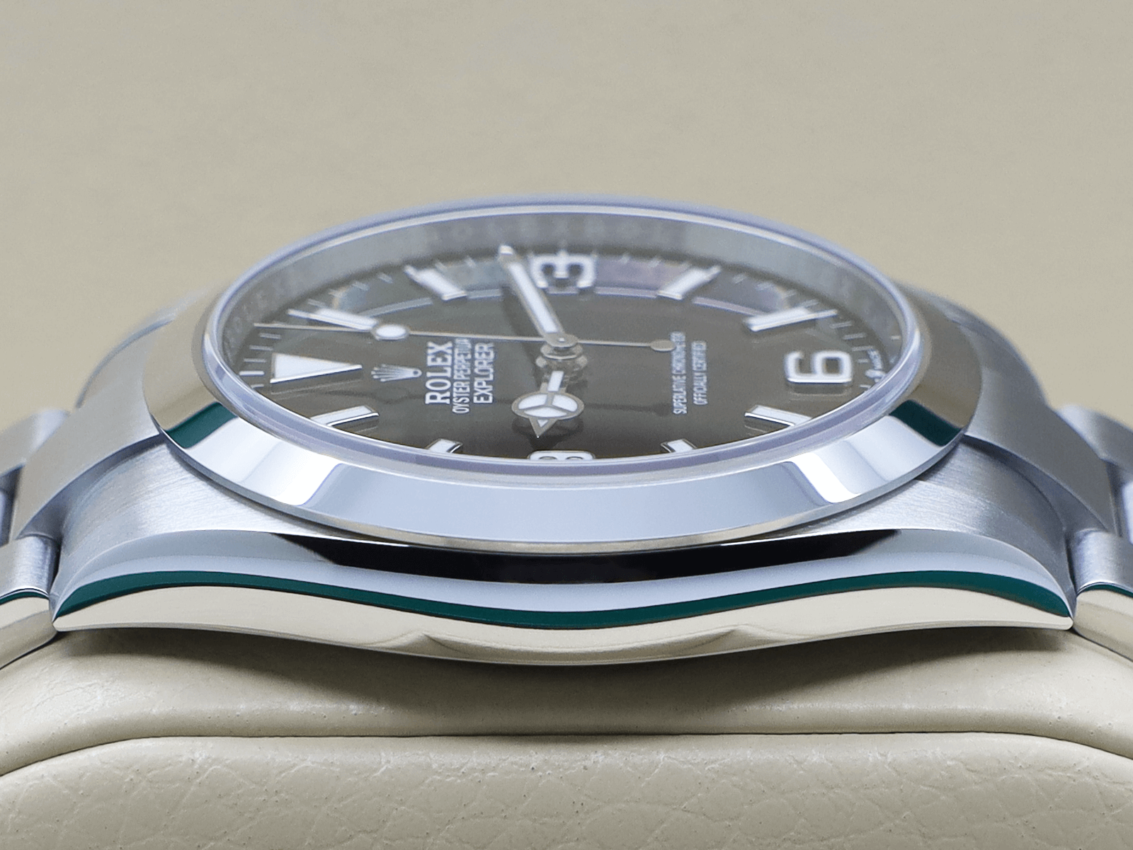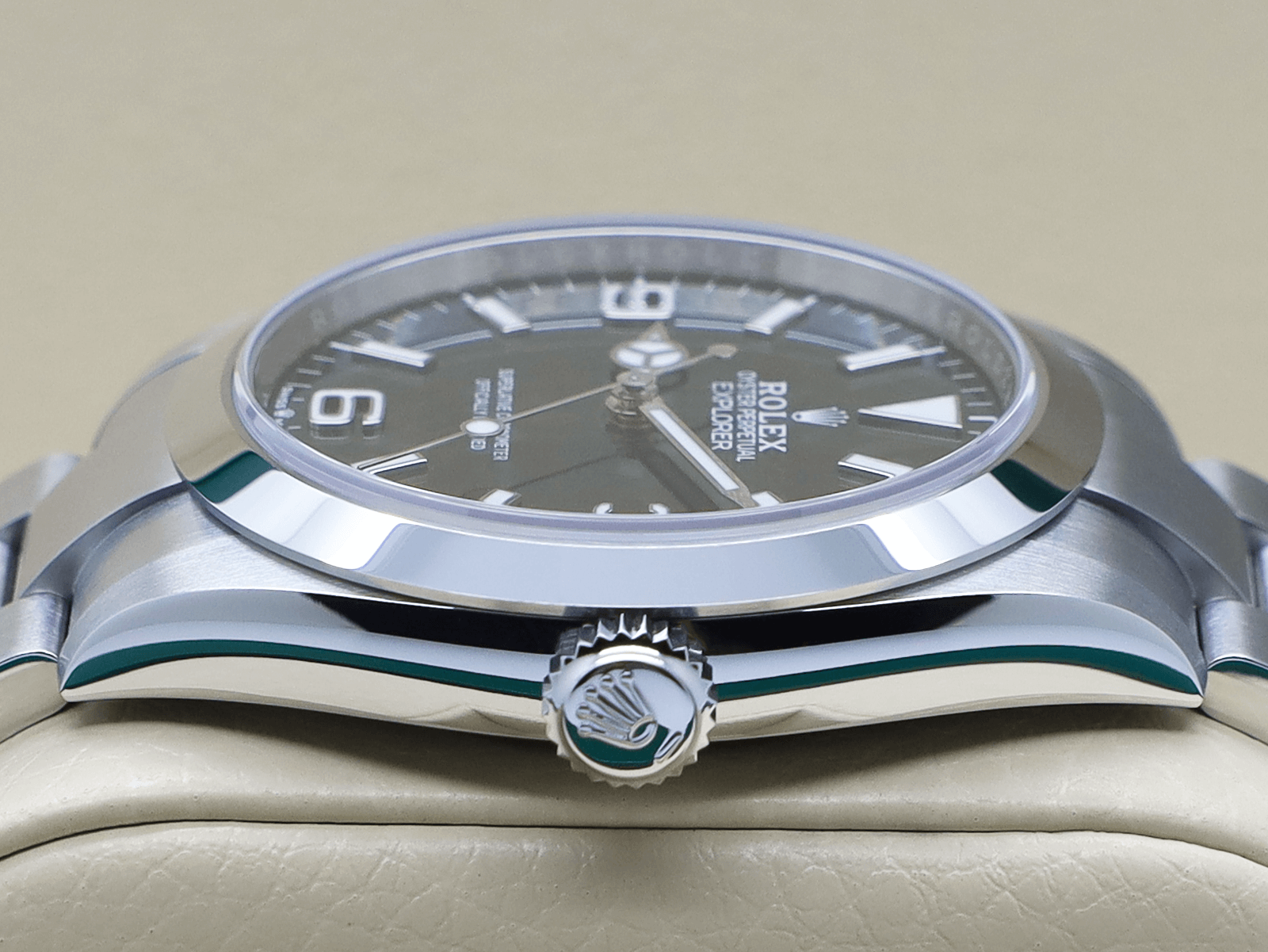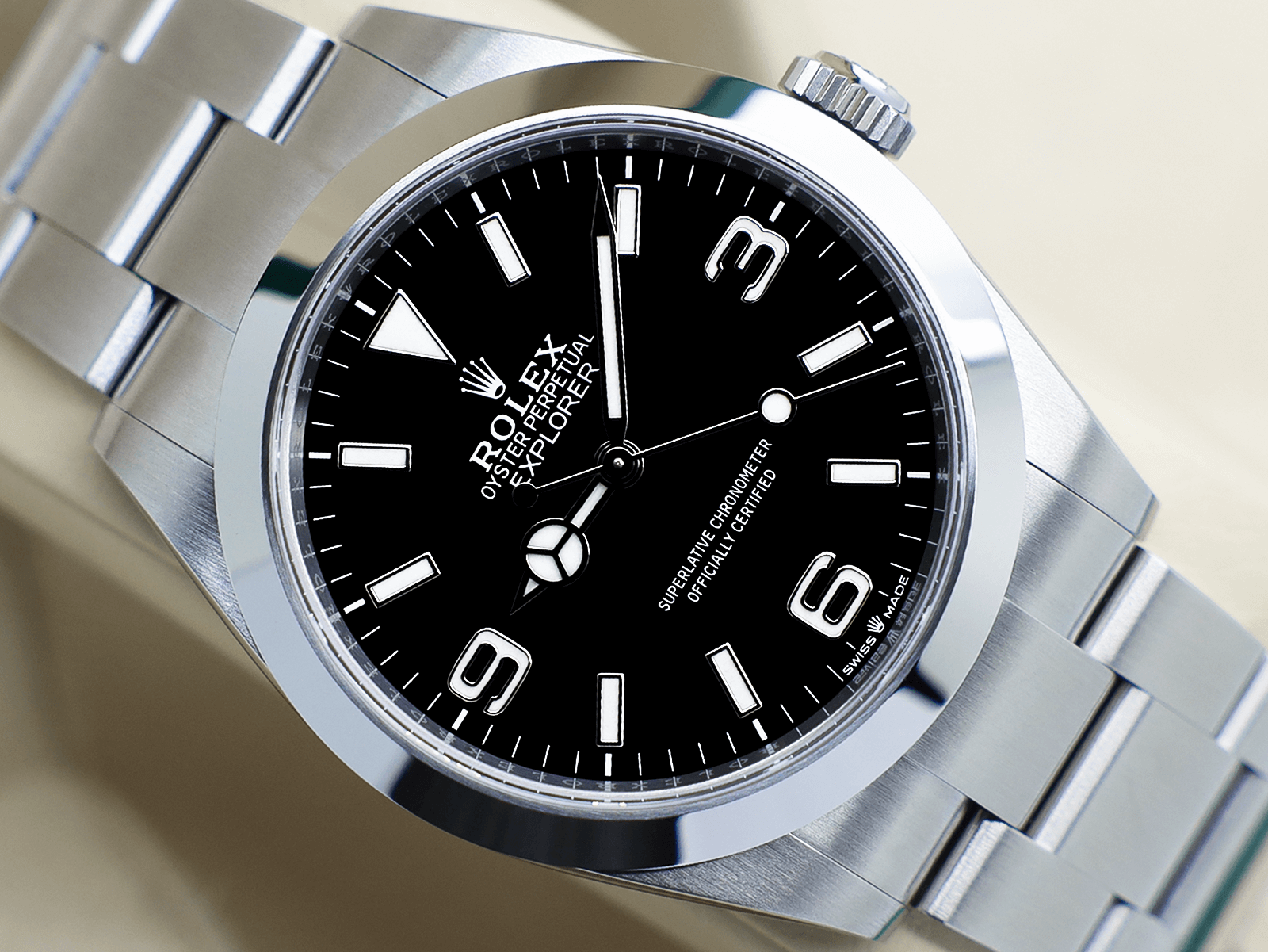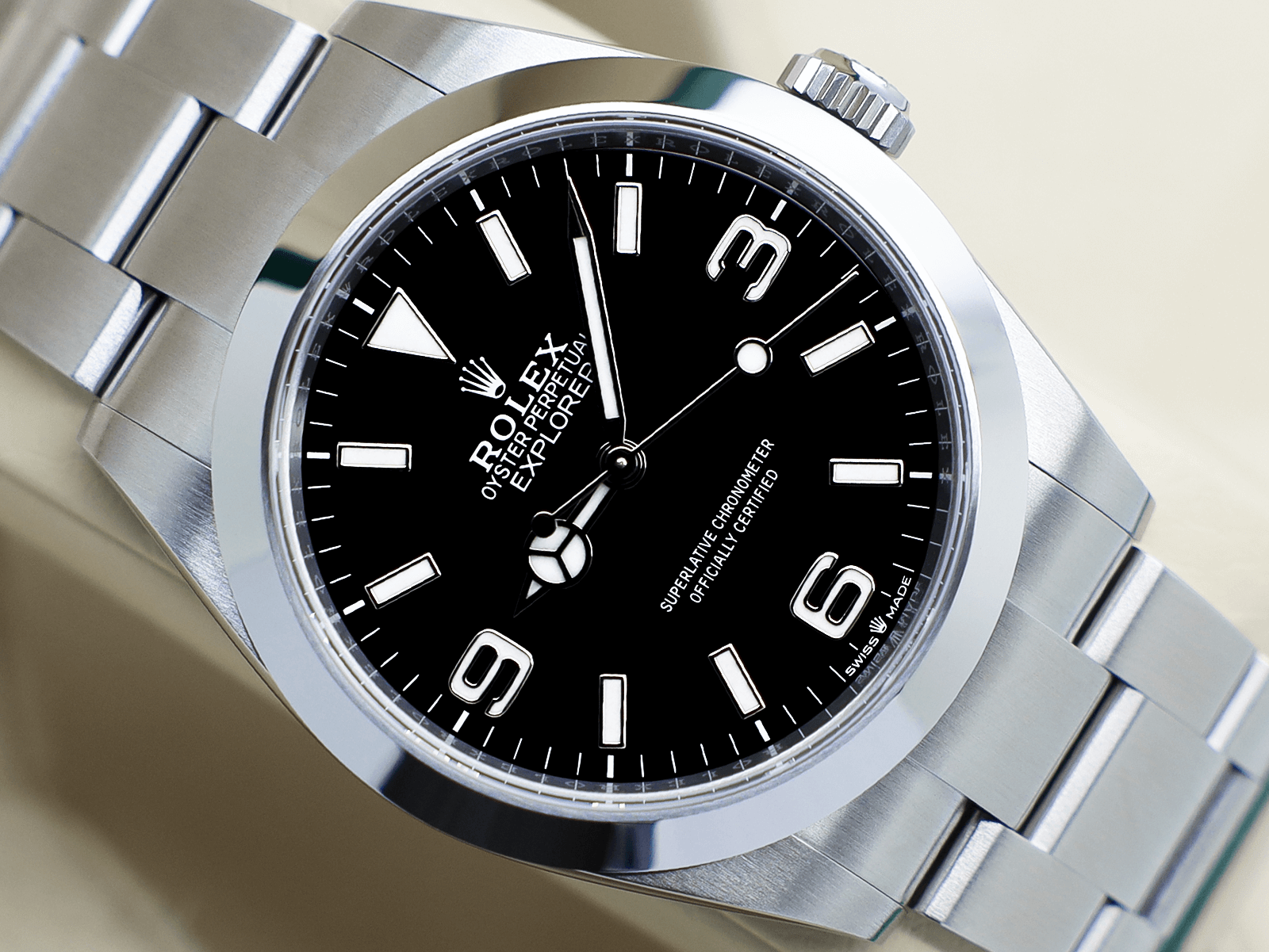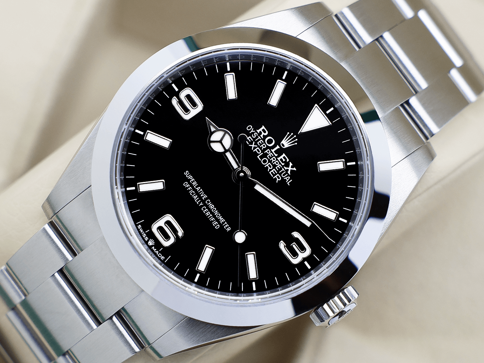 Stunning Gents Rolex Explorer 40mm Watch in Stainless Steel with a Black Dial and a Smooth Stainless Steel Bezel.