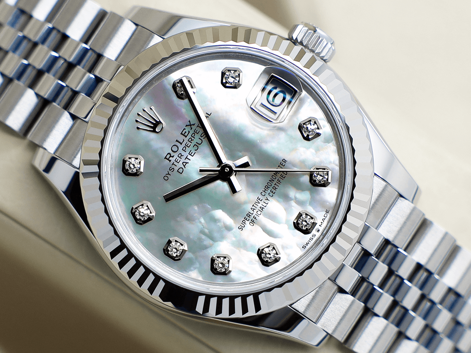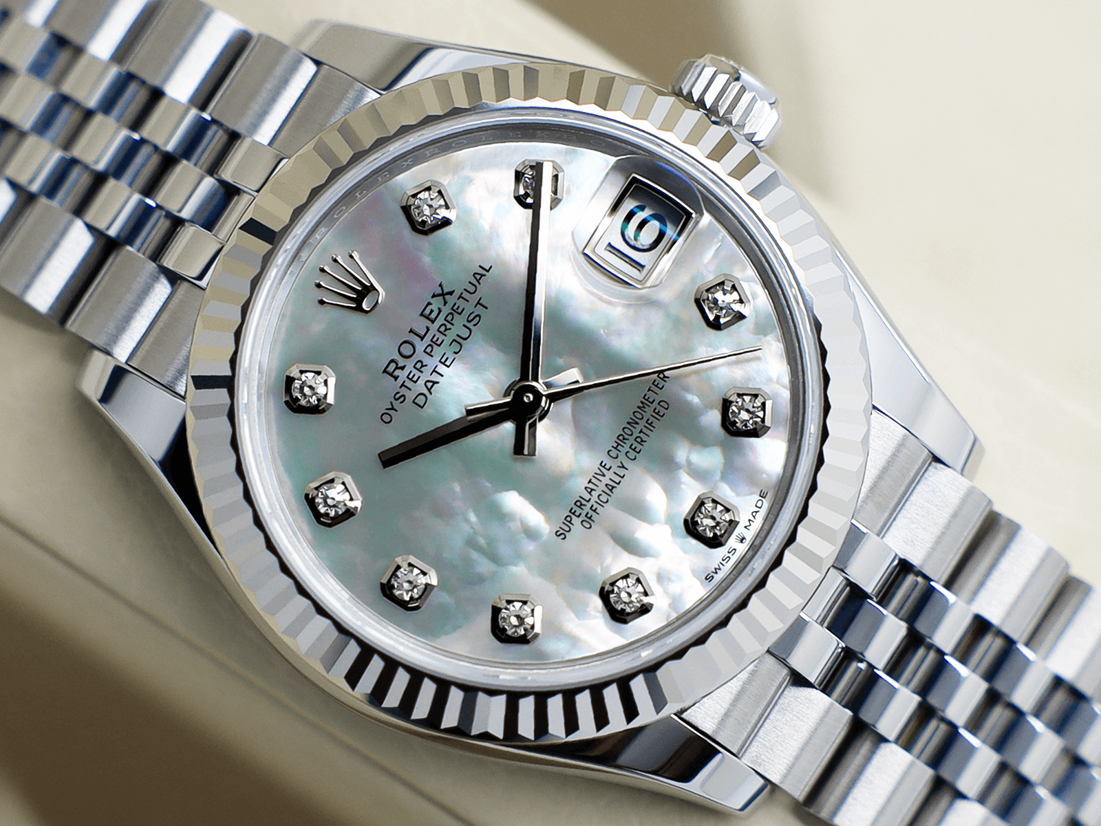 It has The Stunning Highly Sought After Factory White Mother Of Pearl Dial Set with 18ct White Gold Diamond Dot Markers, 18ct White Gold Rolex Crown and 18ct White Gold Hands.