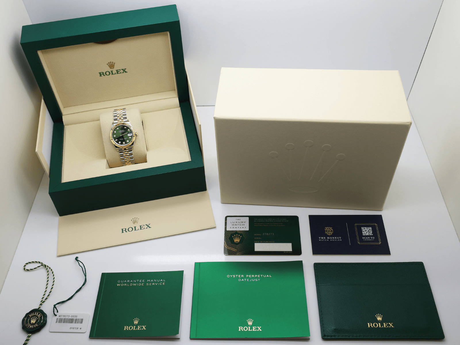 LADIES ROLEX DATEJUST MIDSIZE 31mm 278273 18ct YELLOW GOLD/STEEL OLIVE GREEN DIAMOND DIAL UNWORN WARRANTY 2023 B&P