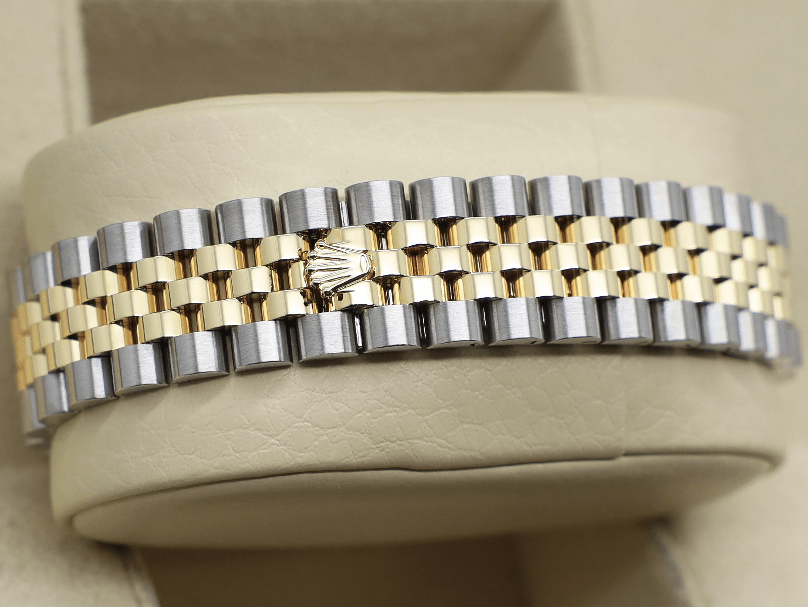 The Rolex 18ct Yellow Gold and Stainless Steel Jubilee Bracelet has a Full Retail Length and is Fitted with The Hidden Folding Safety Clasp.