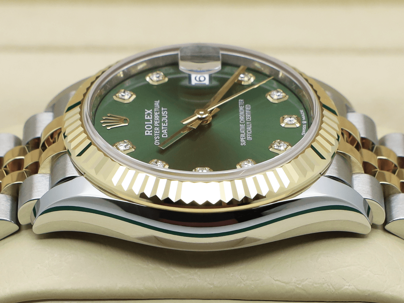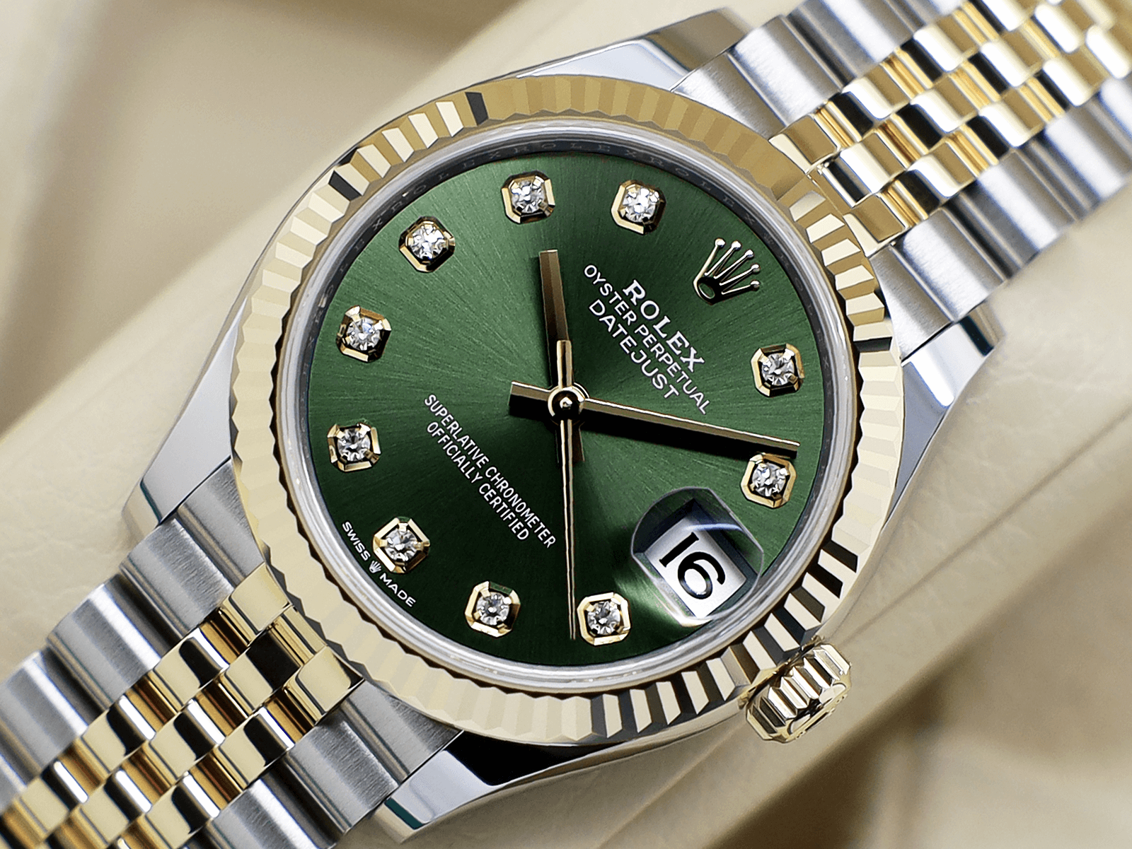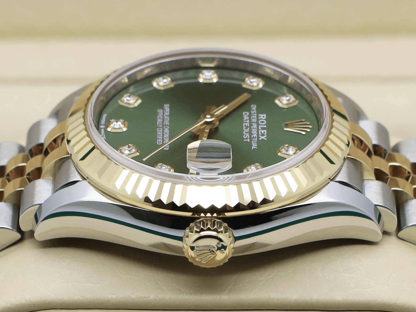 Stunning Ladies Rolex Datejust Midsize 31mm Watch in 18ct Yellow Gold and Stainless Steel with an Olive Green Diamond Dot Dial and Solid 18ct Yellow Gold Fluted Bezel.
