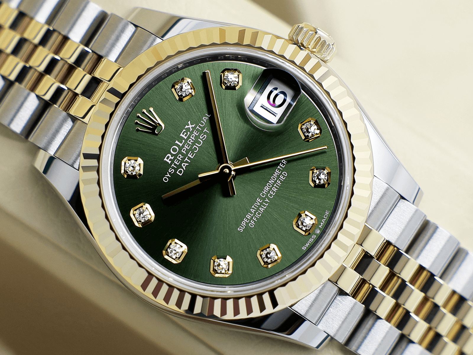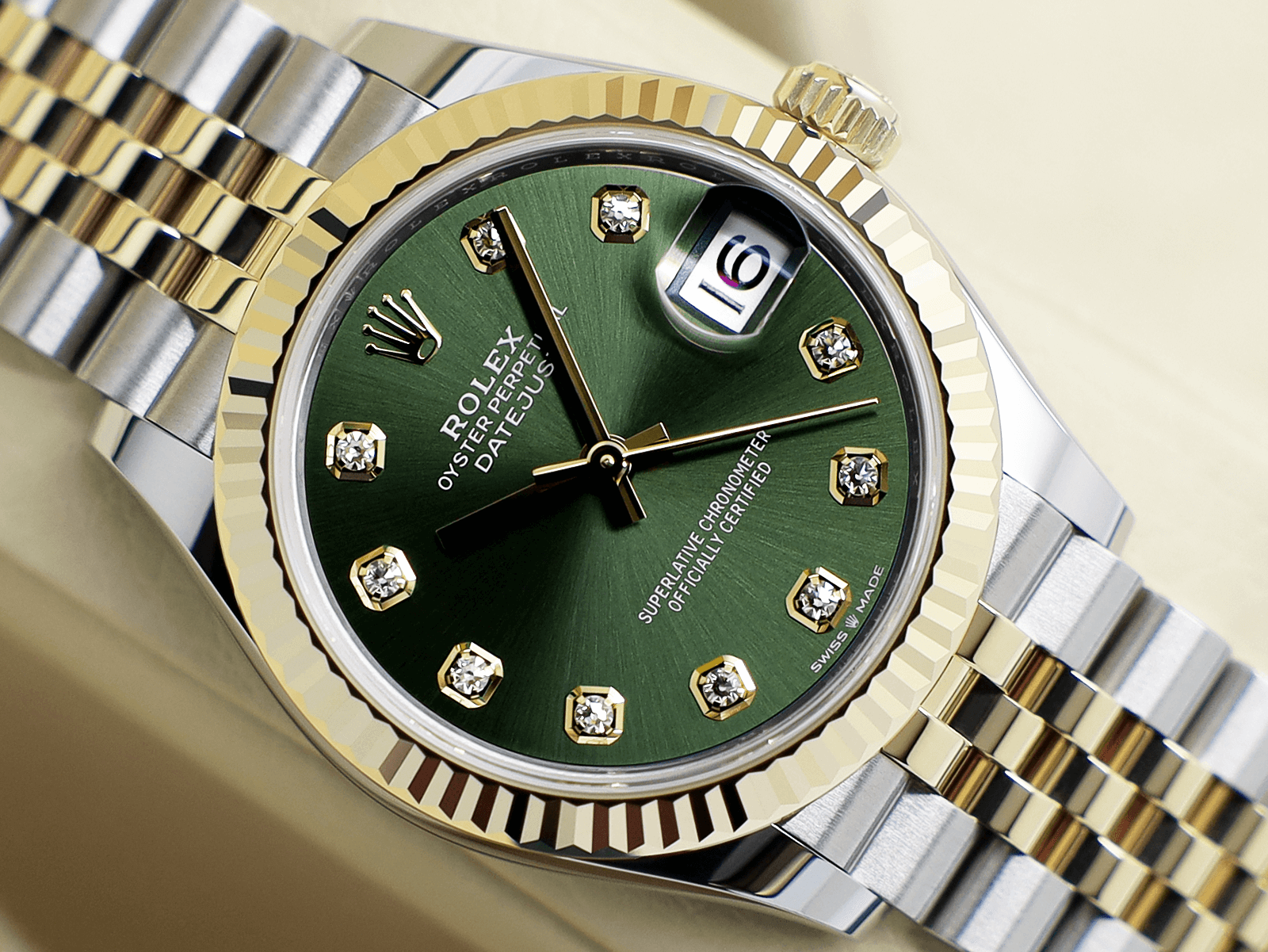 Stunning Ladies Rolex Datejust Midsize 31mm Watch in 18ct Yellow Gold and Stainless Steel with an Olive Green Diamond Dot Dial.