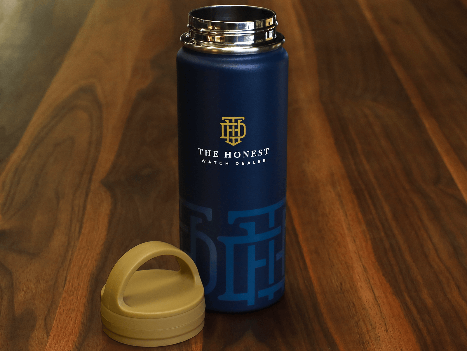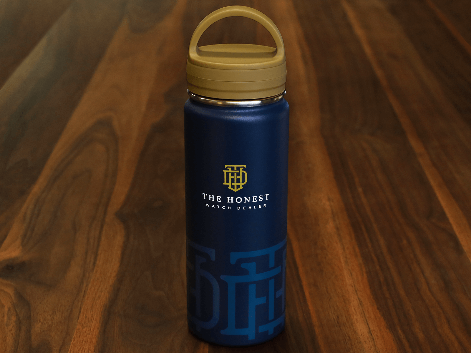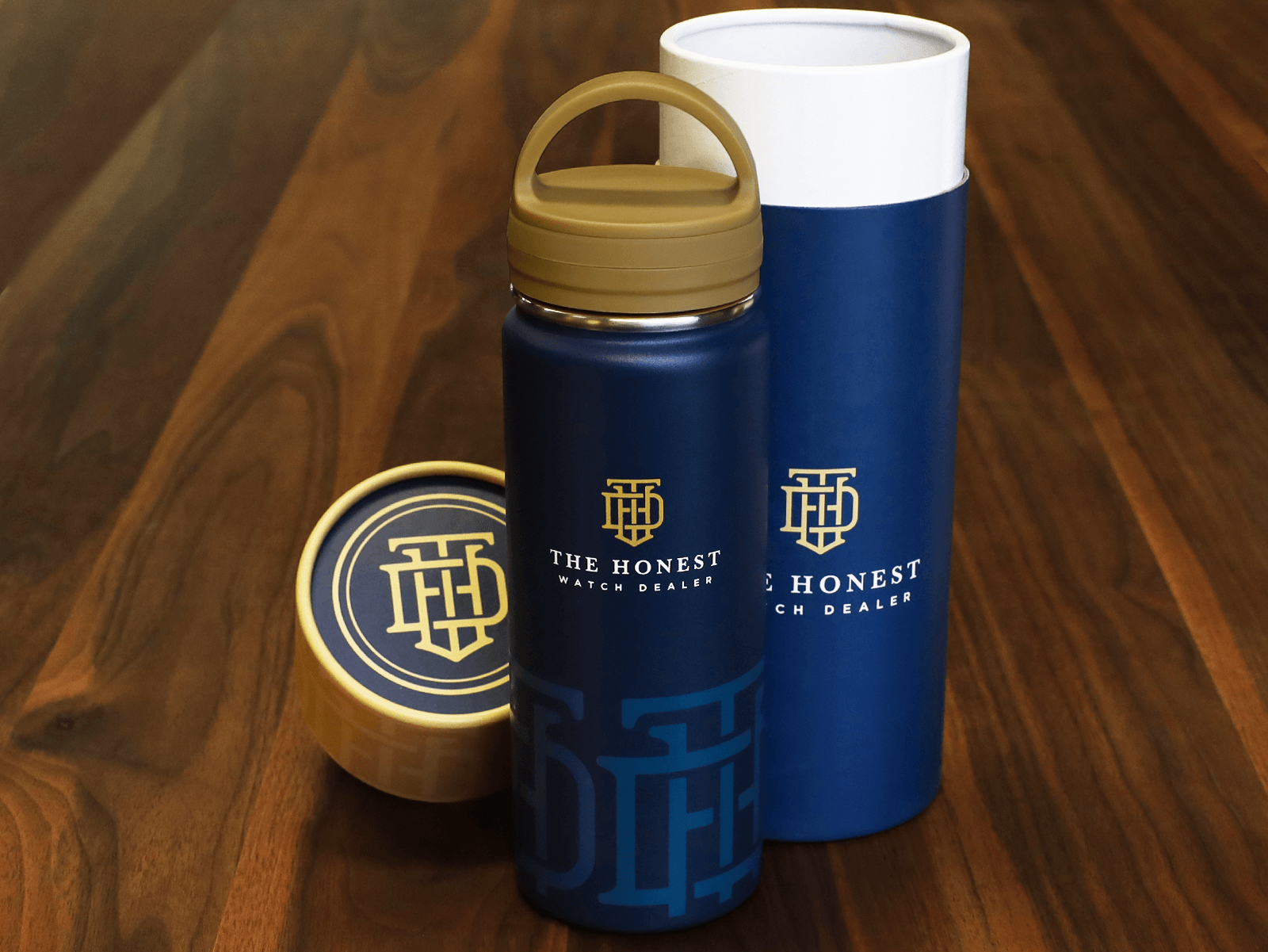 THE HONEST WATCH DEALER BLUE AND GOLD STAINLESS STEEL DRINKS CONTAINER WITH BOX