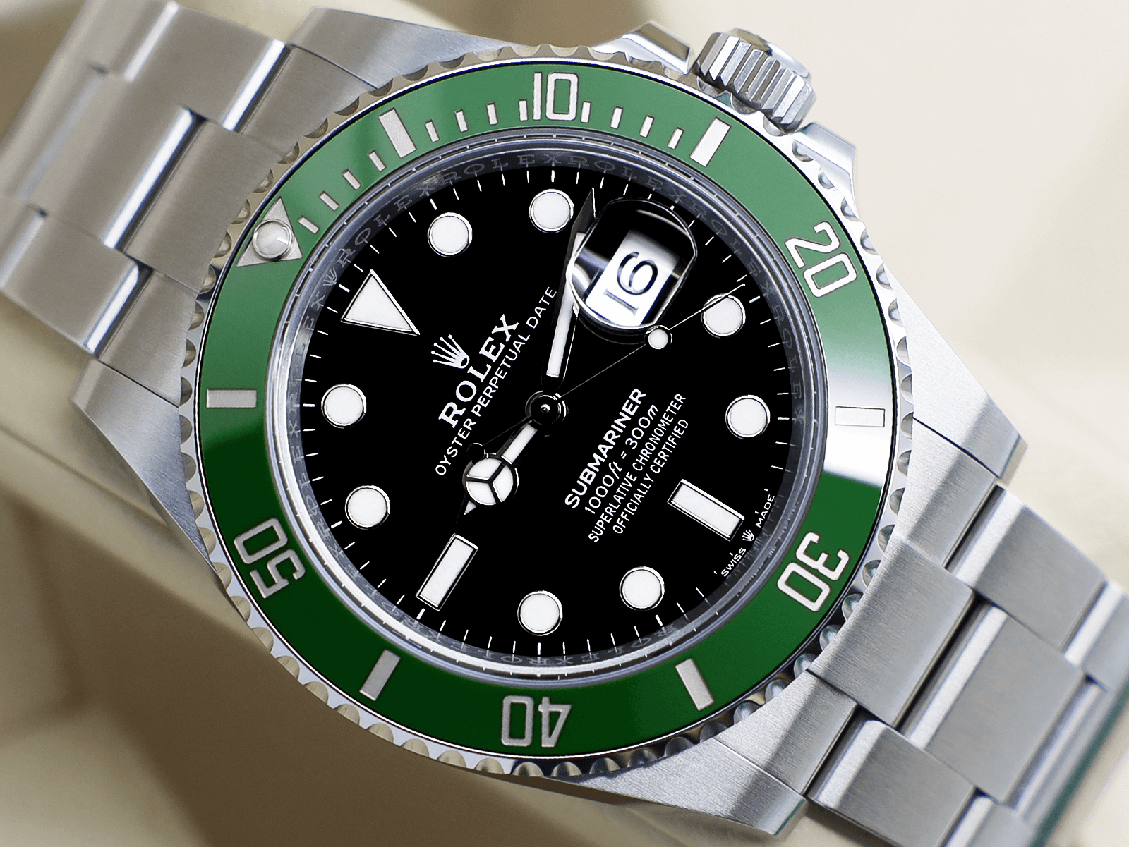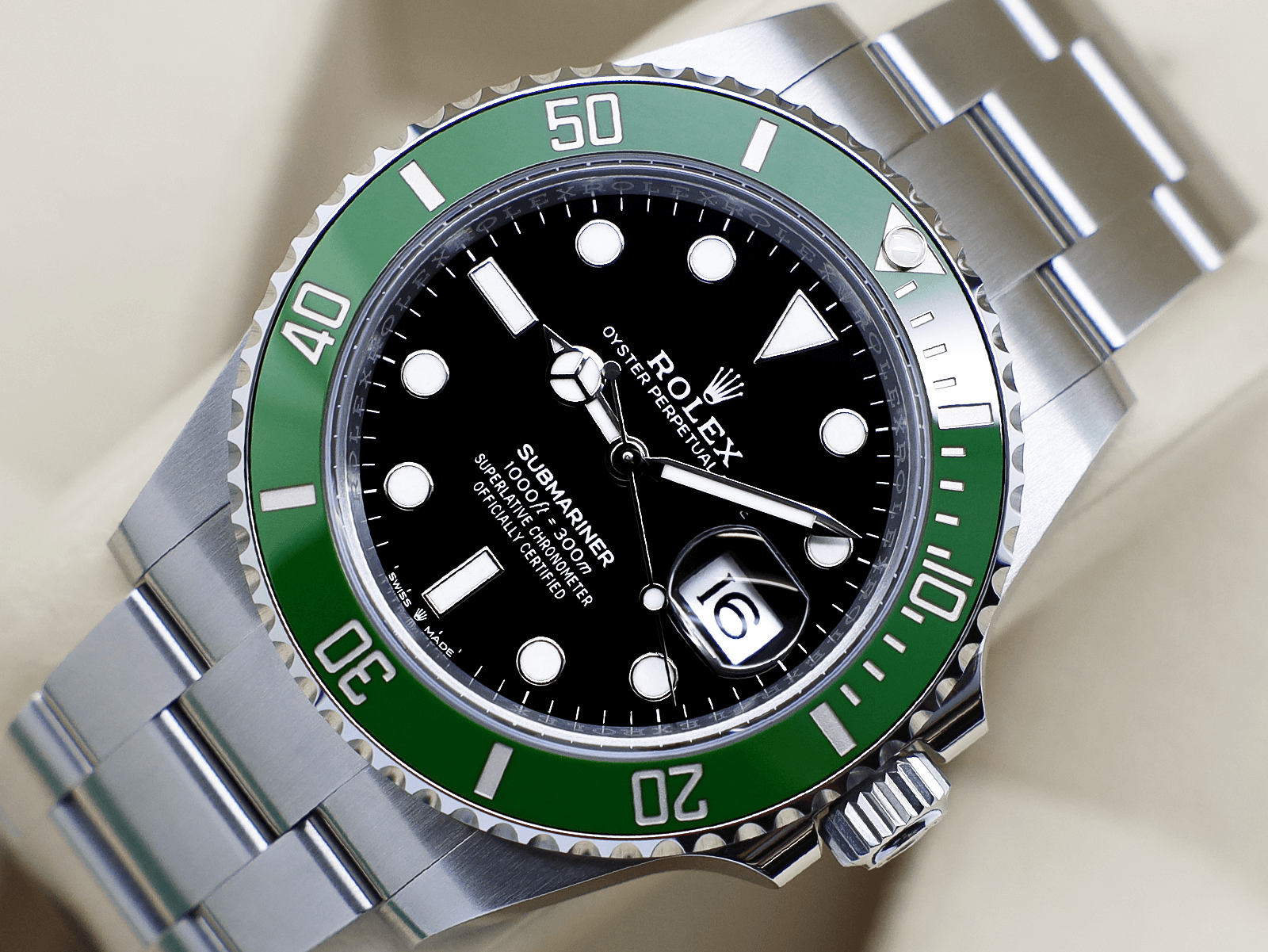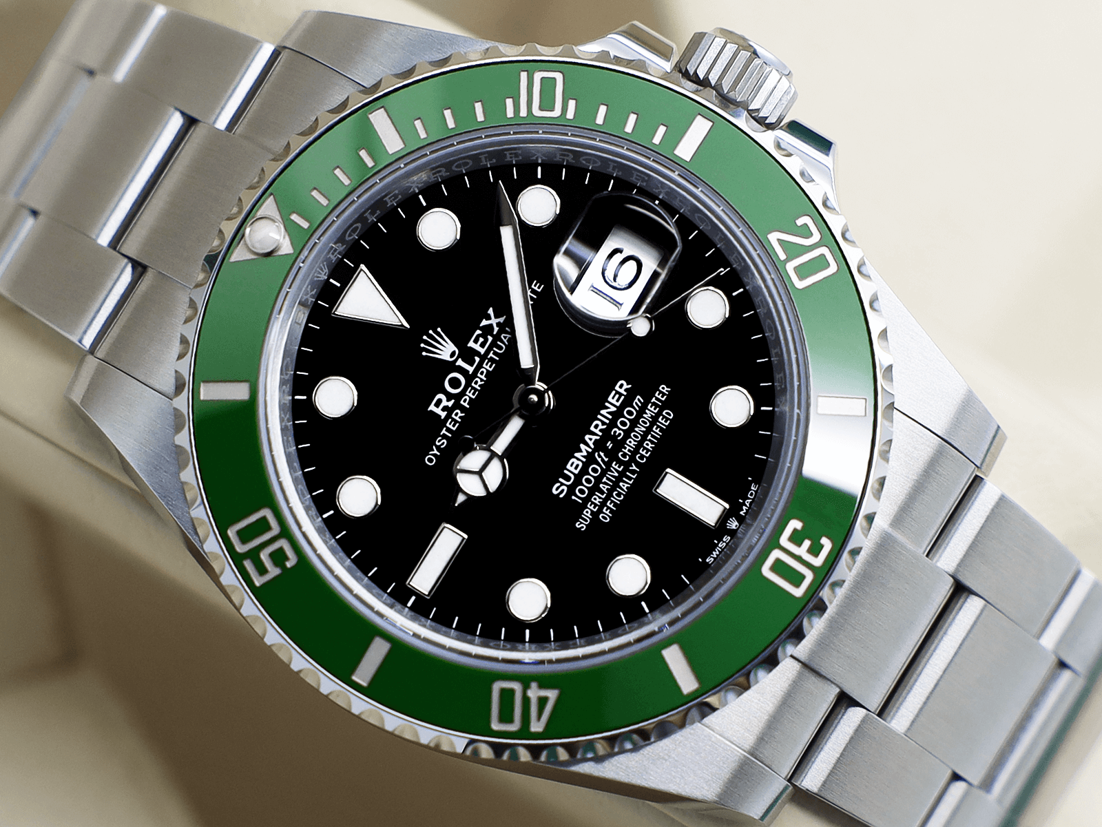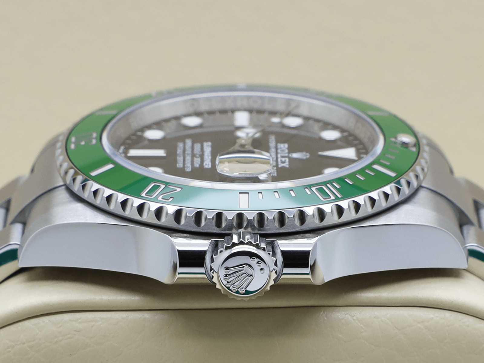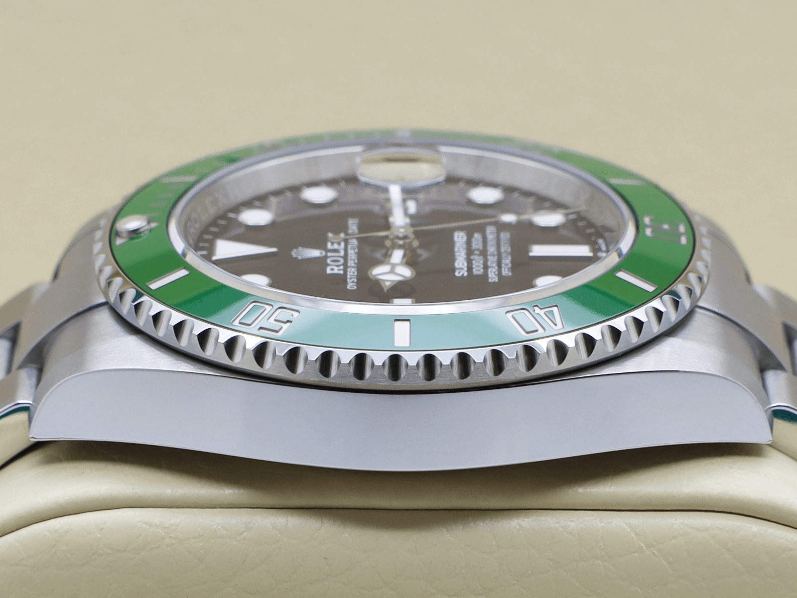 It has a Beautiful Rolex Stainless Steel Rotating Bezel Set with a Green Ceramic Insert with Numerals.