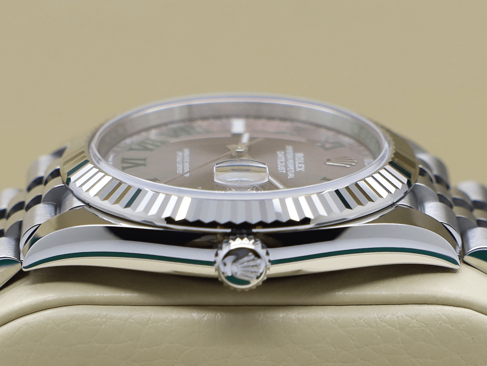 It has The Stunning Highly Sought After Factory Slate Grey ‘Wimbledon’ Dial Set with Green Outlined Black Roman Numeral Markers, 18ct White Gold Rolex Crown and 18ct White Gold Luminous Hands. This is a Very Rich looking and Easy to Read Factory Dial.